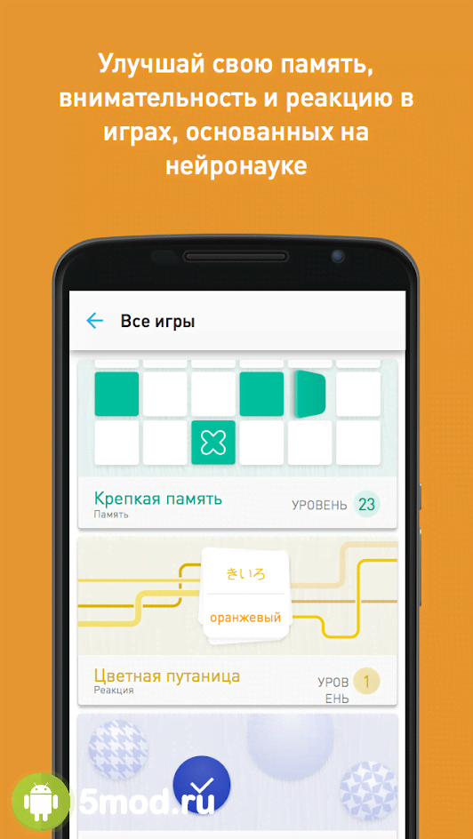 Memorado - Brain Games - увлекательная игра (а точнее сборник игр) для развития и прокачки мозга которая будет интересна геймерам любых возрастов и жанровых предпочтений. Иногда нет настроения для запуска какой-либо динамичного развлечения и тогда на помощь придёт Memorado. Набор в 15 проектов с 450 уровнями различной сложности, приятная графика, ежедневные задания для постоянного поддержания тонуса и многое другое поможет в тренировке памяти, логики, концентрации, реакции и скорости. Каждое действие и решение будет отражаться в статистике, а значит через некоторое время пользователь сможет получить исчерпывающую информацию о своём прогрессе, и будет знать в каком направлении ему двигаться дальше.