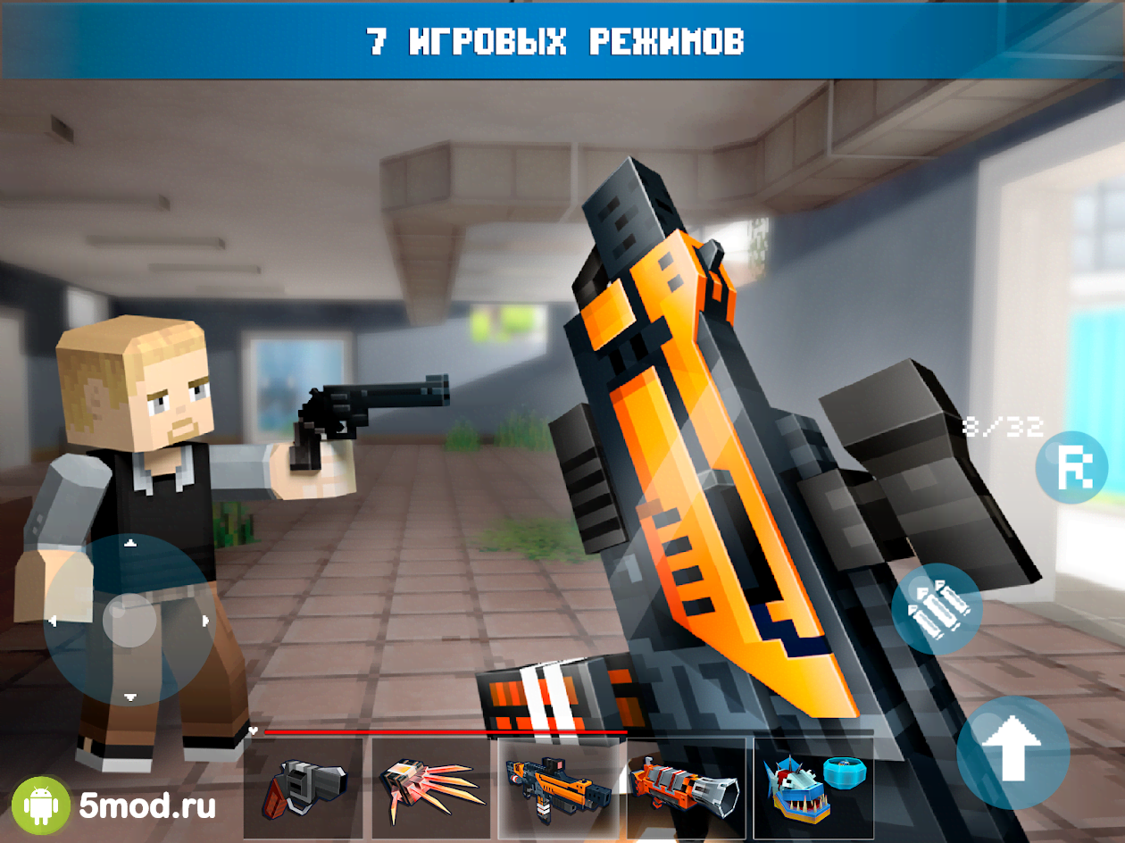 Всего в игре есть 6 режимов: мультиплеер, испытание, приключение, королевская битва, арена и редактор карт. Каждый из режимов уникален по-своему и предлагает выполнение самых разных задач, но в любом случае с оружием в руках. К слову, оружие бывает нескольких типов: основное, которое может быть, как дробовиком, автоматом, снайперской винтовкой или пулеметом, так и дополнительное в виде пистолетов, ножа или биты. Кроме того, не обошлось без гранат и гранатометов. Естественно, перед началом сражения можно закупиться аптечками, подобрать прочный бронежилет и уже после отправляться на поле боя.