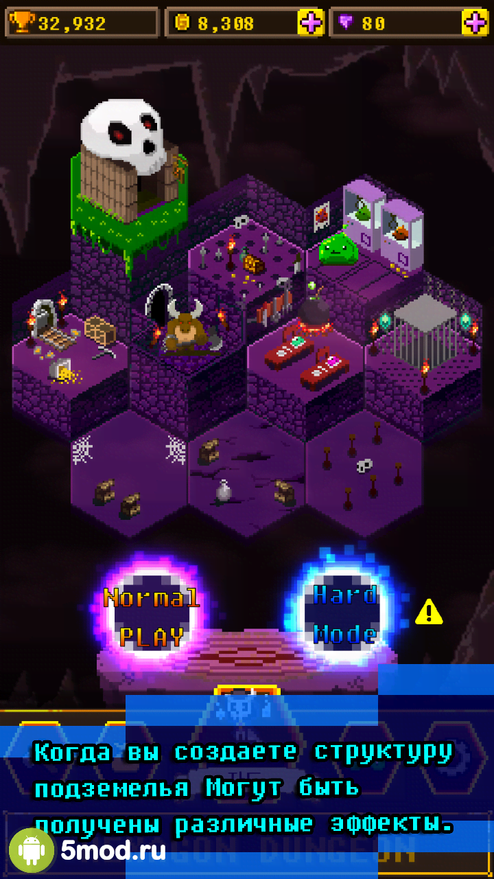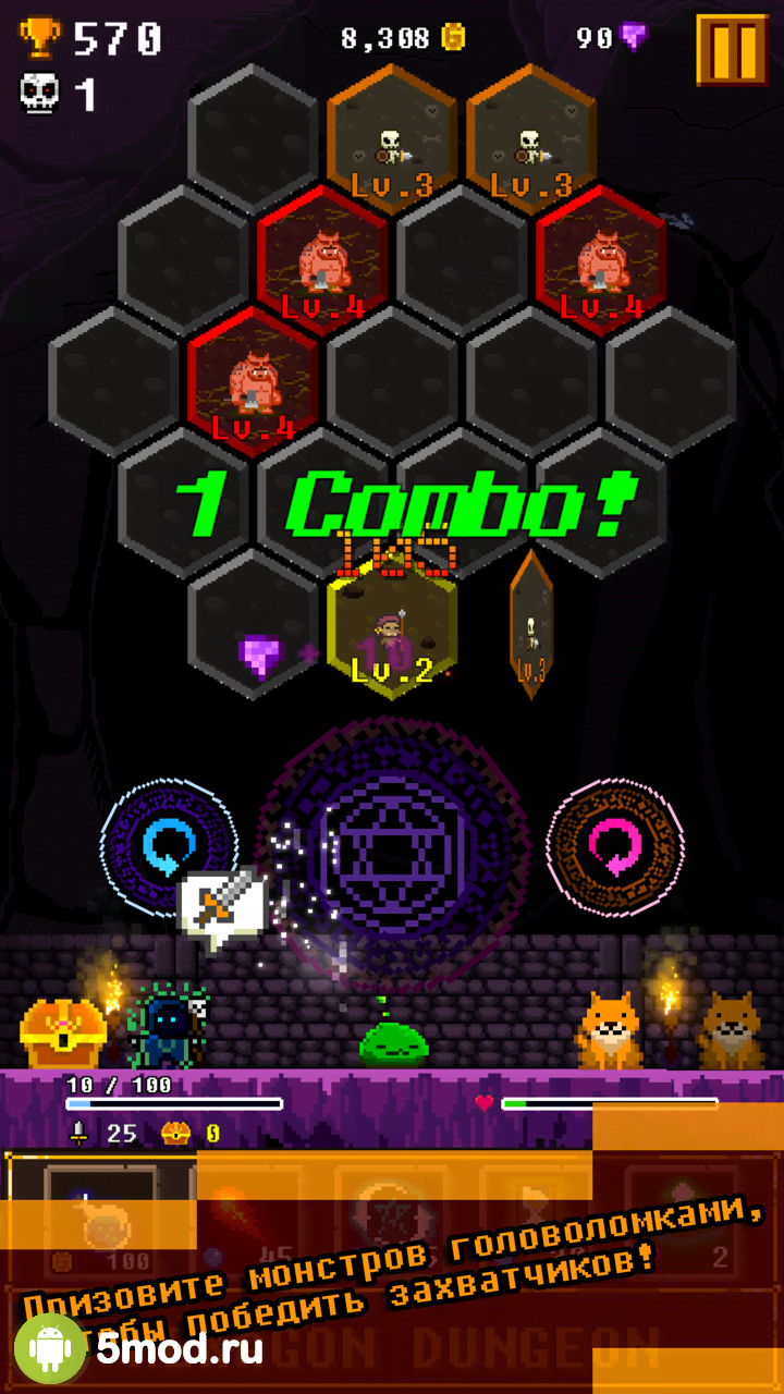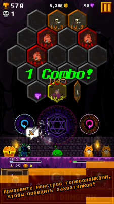 Hexagon Dungeon - отличная головоломка в механике "три в ряд" в котором игроки выступят в роли повелителя демонов. Им необходимо получать как можно более крутых персонажей, что смогут защитить бесчисленное количество подземелий от регулярно появляющихся там героев и прочих спасителей человечества. Небольшое игровое пространство потребует вдумчивого распределения подопечных и правильных шагов на то, чтобы выполнить поставленную задачу. Так же можно использовать ловушки и прочие механизмы, чтобы задержать доблестных нарушителей покоя. И чем лучше у вас получиться, тем больше очков останется на следующий раунд.