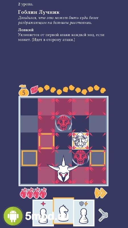 Разыгрывание карты приводит к перемещению фигуры по игровому полю с соблюдением всех правил шахмат. Точно также действуют и ваши оппоненты, вооруженные собственной случайной колодой карт. У игры всего одна цель – расправиться с оппонентом, используя различные тактики и стратегии, стараясь продумывать ход наперёд и получая как можно меньше урона за очередной файт.