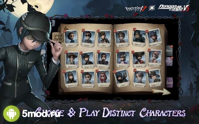 Identity V - захватывающий хоррор в реальном времени, в котором нужно выбраться живым из заброшенного особняка, наполненного ловушками и призраками. В игре вас ждут динамичные сражения 1 против 4, где каждый игрок выполняет определенную роль. Охотник должен поймать всех жертв, используя различные способности и ловушки, а выжившие пытаются всеми силами совершить побег из особняка. Взаимодействуйте с товарищами по команде, открывайте ворота, ломайте ловушки и заманивайте противника.