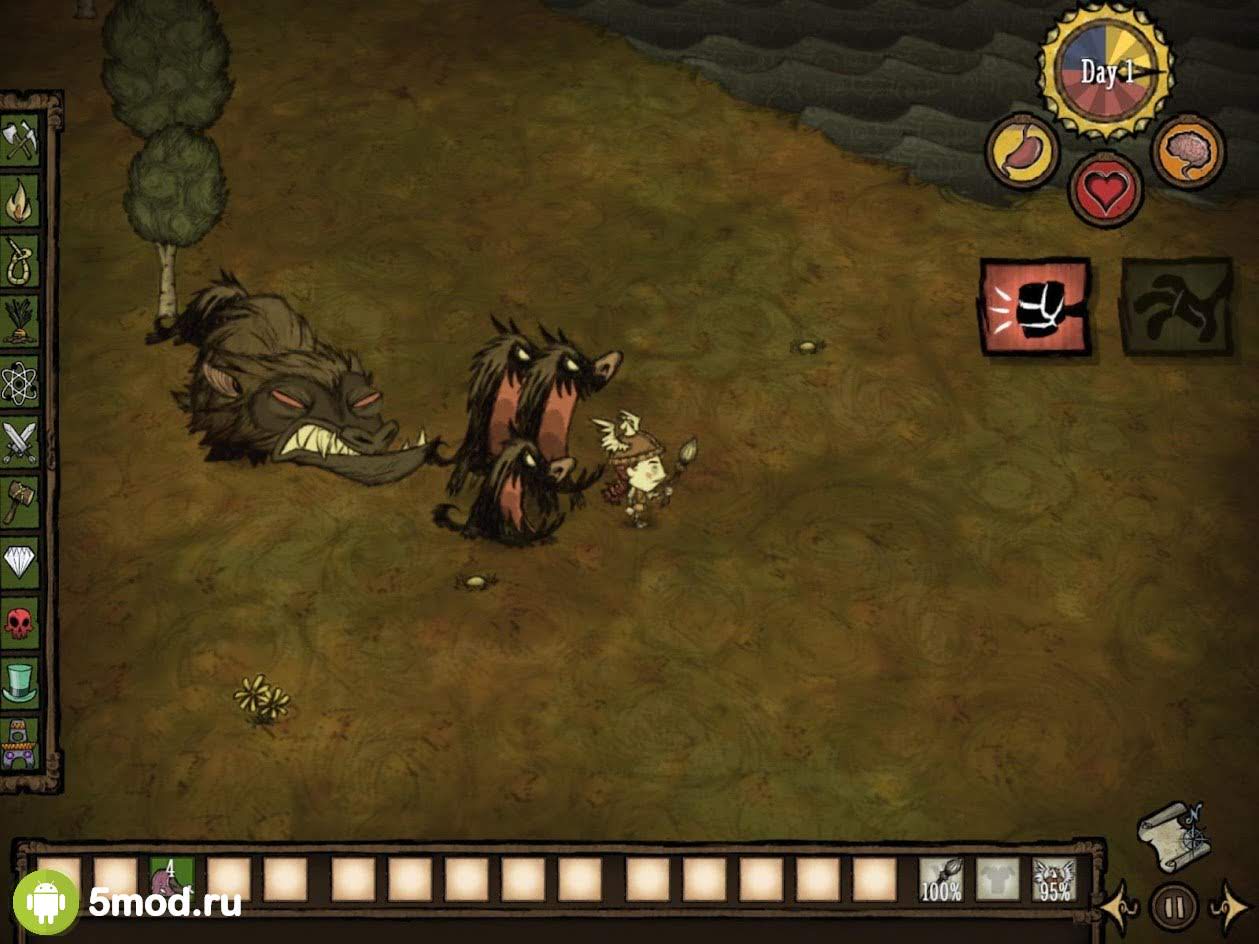 С управление проблем возникнуть не должно, как и в оригинальной версии, чтобы передвинуться по игровому полю достаточно будет нажать на нужную вам точку. Удержание пальца на предмет позволяет открыть вспомогательное меню действий. У вас также будет несколько панелей, где располагаются все подобранные предметы и всё то, что вы сможете скрафтить.