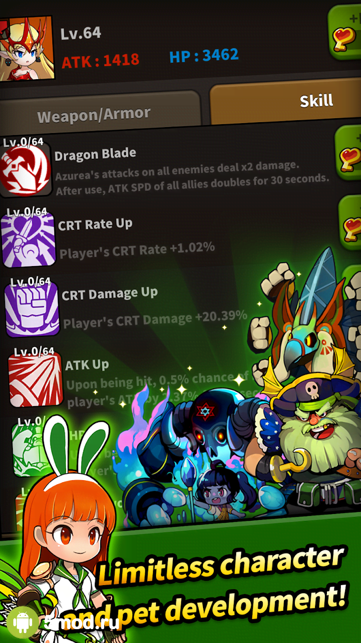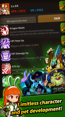 Выбирать между персонажами не имеет никакого смысла, прокачка характеристик для каждого из существ идет одинаково, меняется лишь набор используемых умений и навыков. В момент начала игры вы увидите игровое поле, которое разбито на две части. В верхней отображается ваш персонаж, который самостоятельно двигается по локациям и расправляется с монстрами. Нижняя часть отведена для прокачки характеристик вашего персонажа, изучения новых умений, а также прокачки будущего питомца, коим может стать огнедышащий дракон.