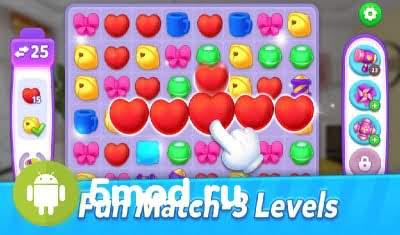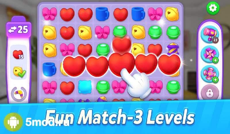 В игре очень много комнат, которые предстоит изменить, добавляя в них мебель, перекрашивая стены, устанавливая технику и элементы украшения. Получить все это можно только за монетки. Они в свою очередь зарабатываются за счет решения несложных головоломок в жанре «3 в ряд». Меняйте местами соседние элементы, собирайте их в ряды по три штуки и более, зарабатывайте очки и выполняйте задания.