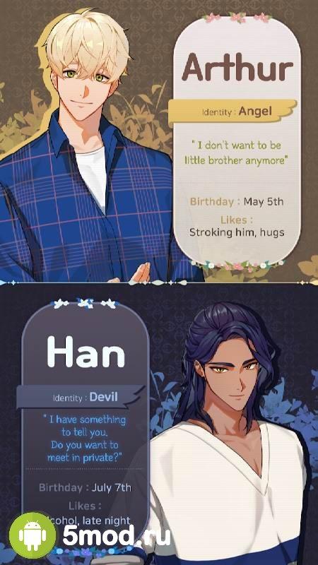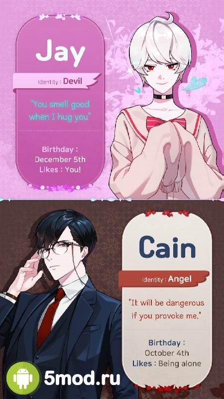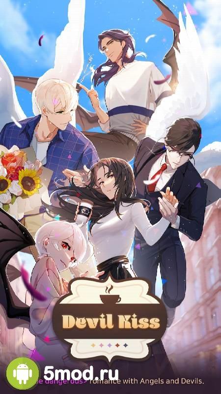 Devil Kiss :Romance otome game – интересная отомэ-игра в привычном исполнении с ангелами и демонами. Игроки могут создать собственную историю, используя непростые решения и совершая трудные выборы. Попробуйте себя в роли главной героине и дойдите до конца, постепенно завоевывая любовь остальных персонажей. Всего вас ждет свыше 200 вариантов, красочные иллюстрации и множество скрытый событий. Никто не знает, что скрывается за тем или иным героем.