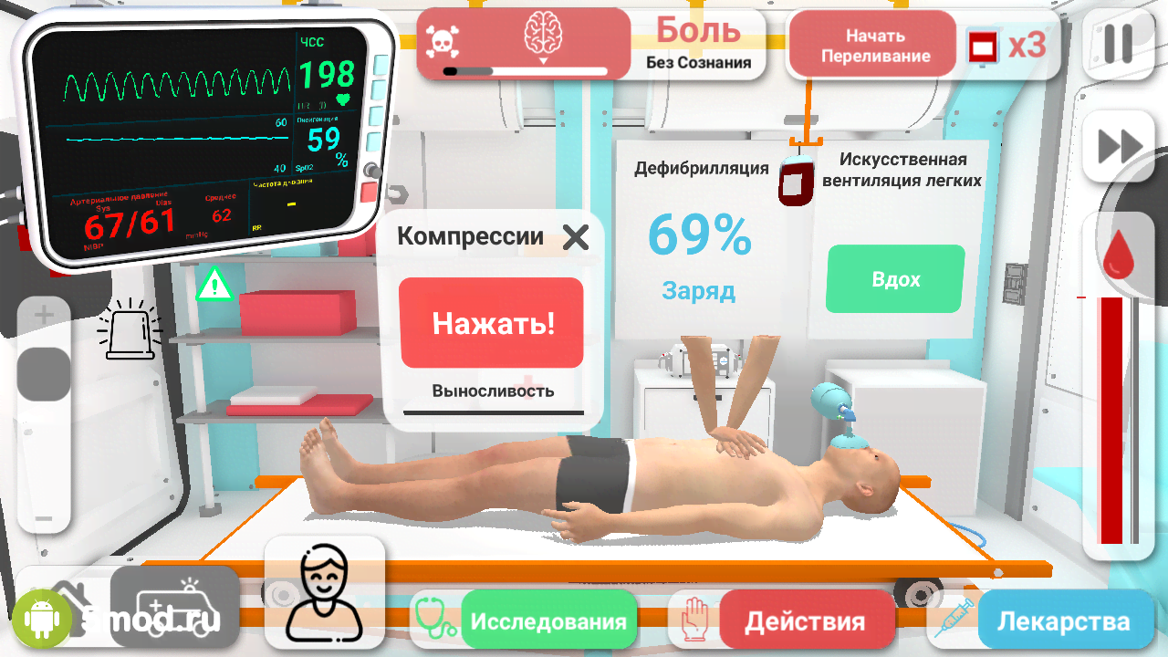 Reanimation inc - realistic medical simulator - просто отличный симулятор в котором геймеры станут врачами спасающими жизнь пациентам. В их распоряжении современный автомобиль реанимации в котором установлены различные аппараты и разложены препараты. А так же есть меню с командами. Игрокам остаётся только правильно всё это применять в зависимости от ситуации с поступившим к ним на стол человеком. И вот тут то и начинается самое интересное, увлекательное и непредсказуемое. Любая ошибка может стать критичной и лишит их награды, а значит они не смогут проапгрейдит гаджеты или обновить арсенал ампул для следующего случая.