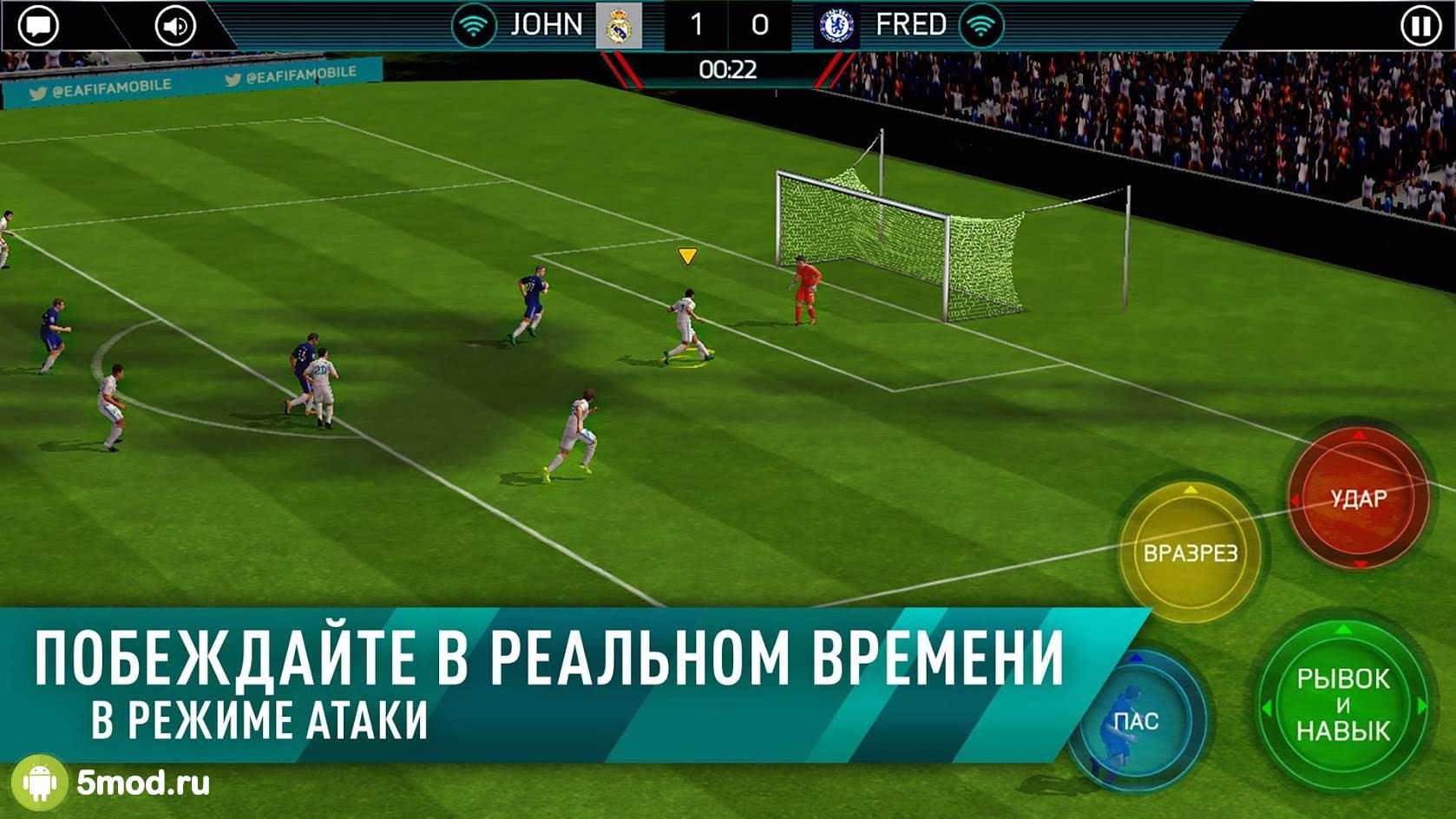 FIFA Soccer - один из самых успешных популярных и увлекательных футбольно-спортивных проектов на данный момент для мобильных платформ. И это немудрено, ведь за его разработку и ведение отвечает ELECTRONIC ARTS. В игре красивая, качественная графика, а так же огромное разнообразие возможностей и вариантов времяпрепровождения. Геймеры смогут собрать команду своей мечты из любимых и именитых футболистов, а после отправить её на поле стадиона, для соревнований в PvP режиме. 90-секундные матчи будут максимально насыщены динамикой, опасными моментами, а так же ликованием трибун из-за забитого в ворота мяча.