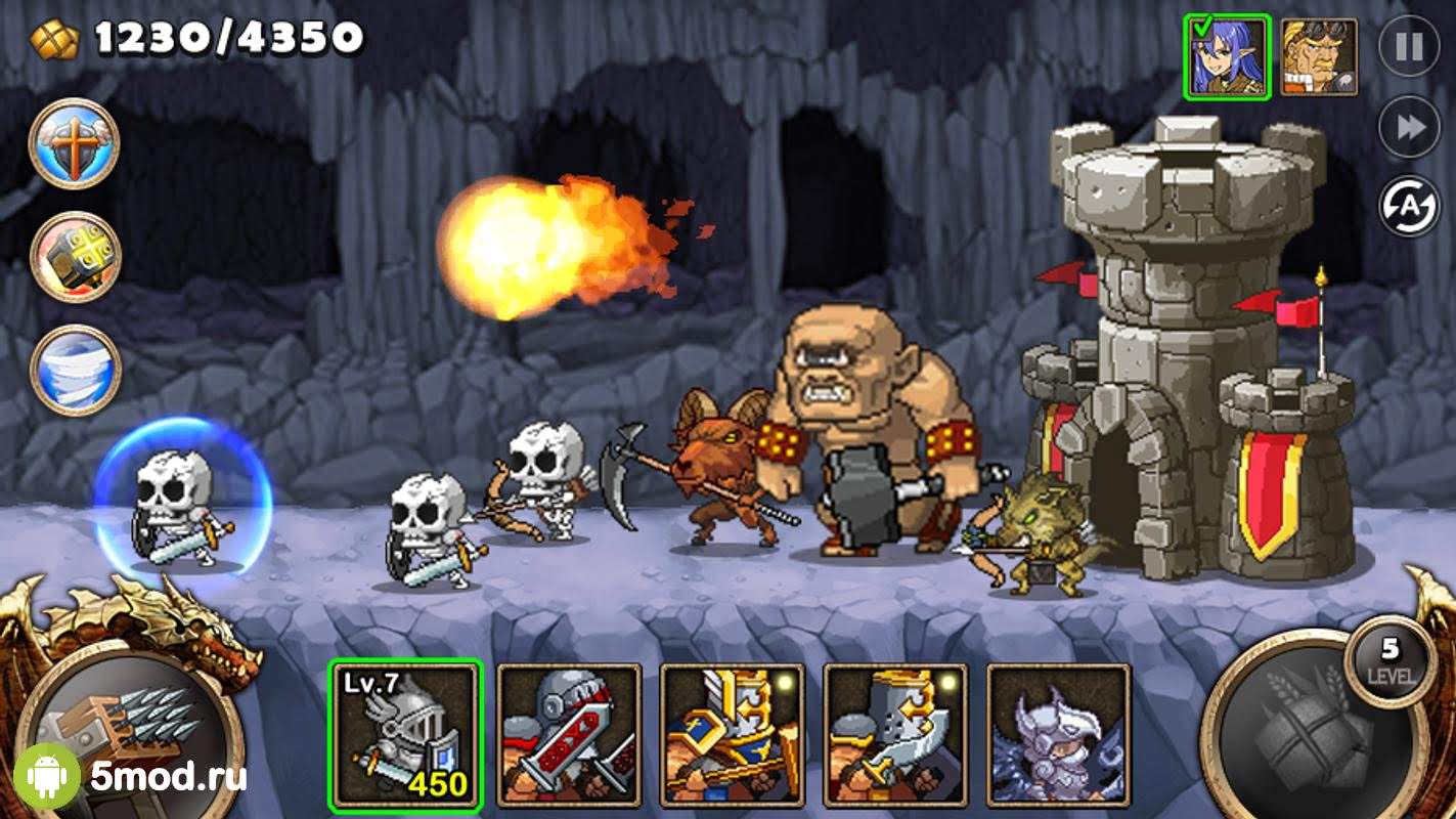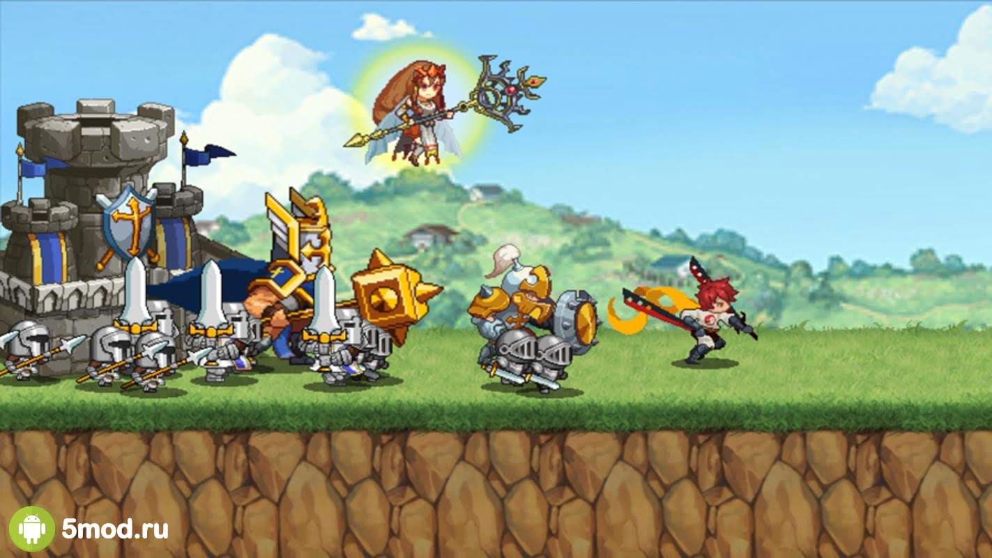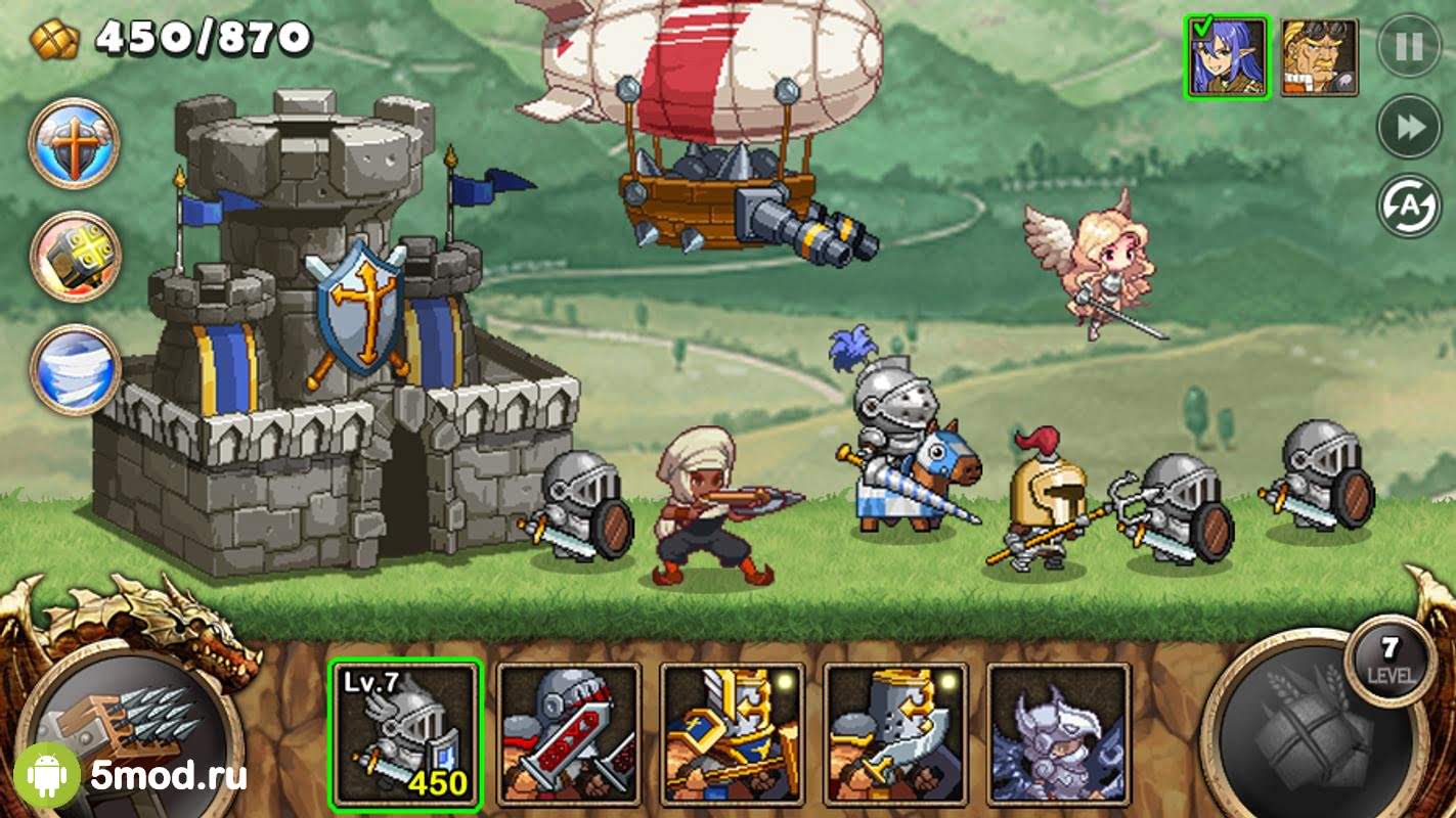 Геймплей игры представлен в виде стратегии «стенка на стенку», где необходимо уничтожить замок противника, чтобы пройти уровень. Изначально, под контролем игрока будет всего один персонаж – рыцарь, затем появится щитоносец в крепких доспехах, лучник, маг и даже добрые монстры, оказавшиеся на вашей стороне. Для призыва новых персонажей достаточно будет нажать на их иконку в нижней части экрана, но для этого вам потребуется валюта – еда, накапливающаяся и восстанавливающаяся автоматически.
