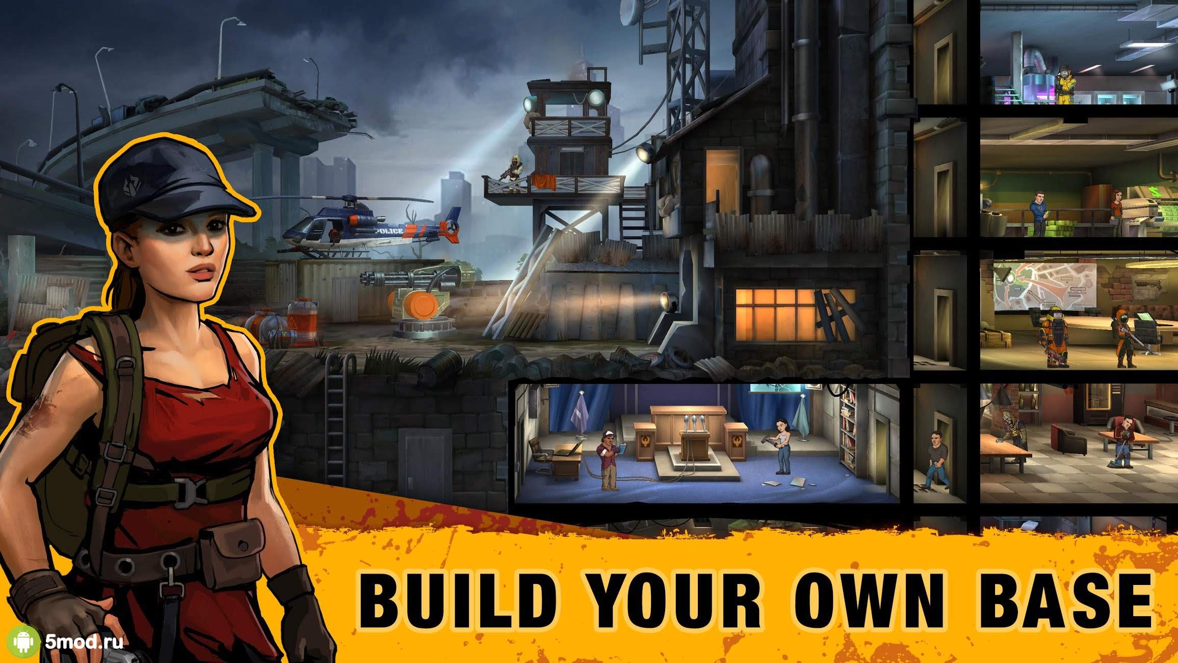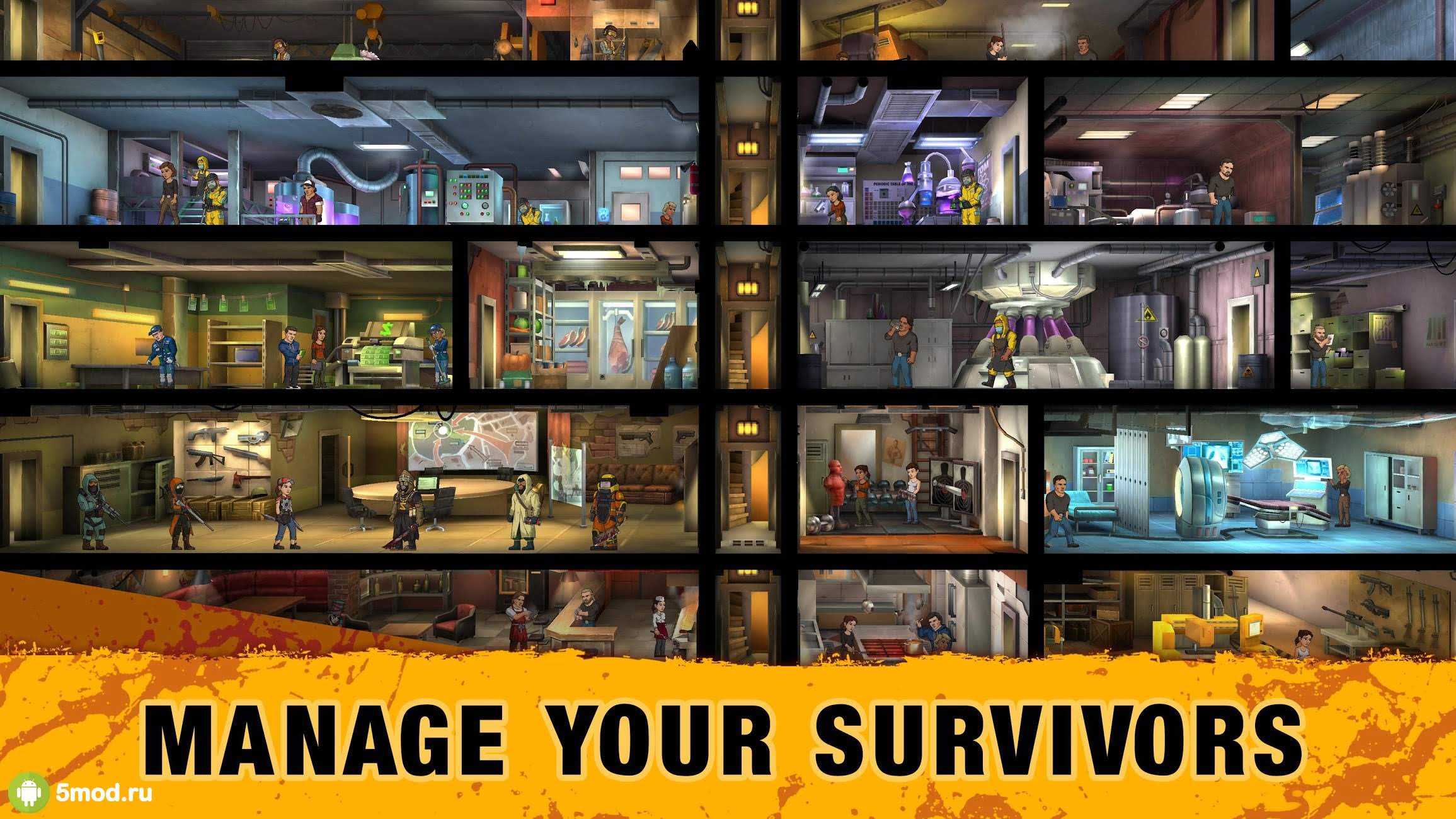 В вашем распоряжении окажутся самые разные рабочие, которые готовы выполнить любой приказ в любое время. Нужно строить такие постройки, как: электрические станции, оружейную, казармы, столовые и прочее. Не забывайте развивать постройки и самих жителей, чтобы они смогли более эффективно и быстро выполнять ваши приказы. Выбирайте только лучшее снаряжение для своих воинов, отправляйте их на защиту лагеря и исследование новых локаций, чтобы собирать ресурсы, еду, медикаменты и боеприпасы.
