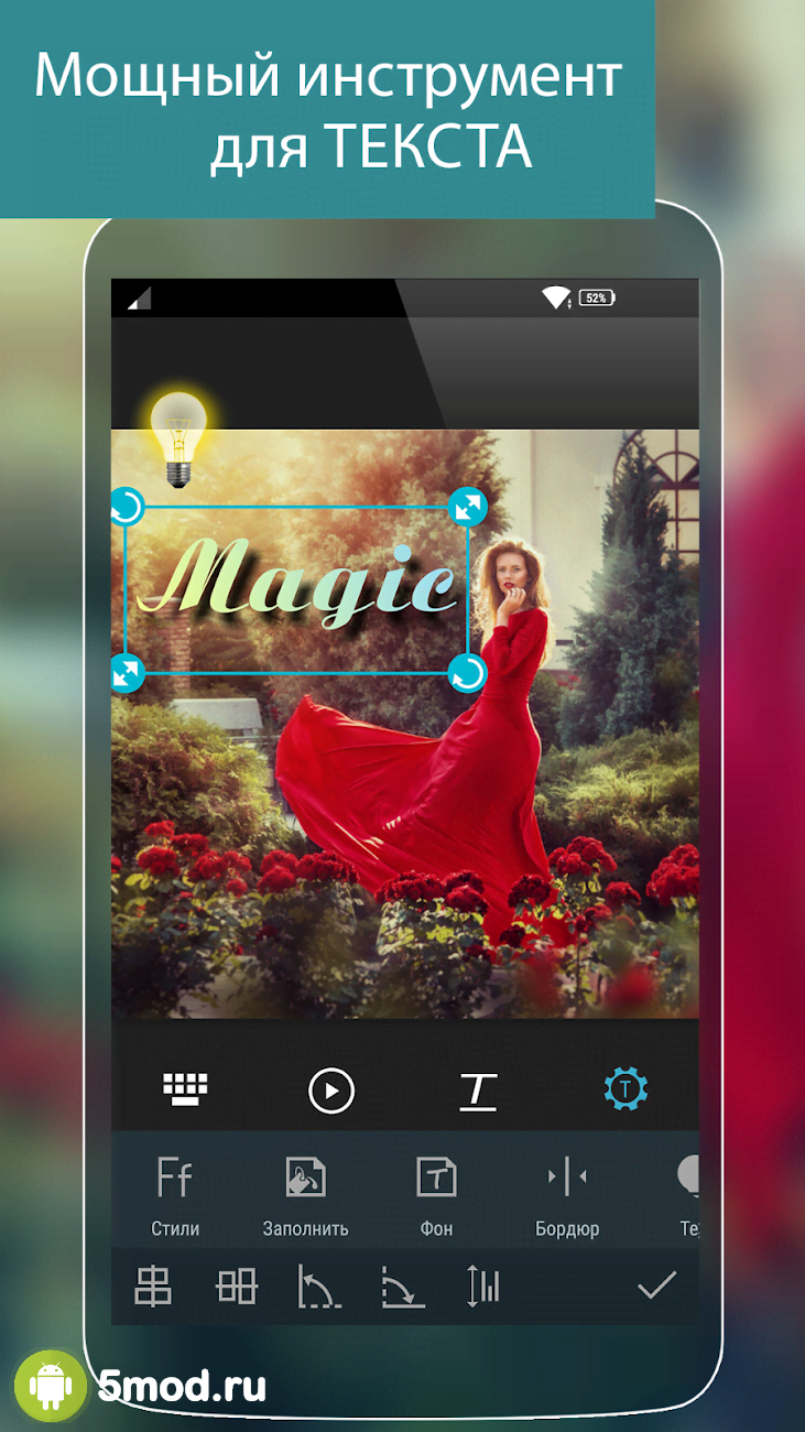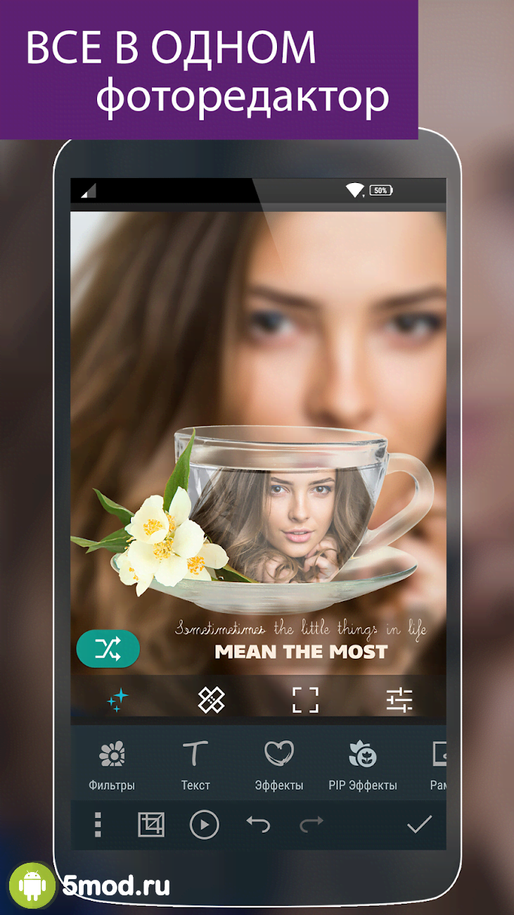 Photo Studio PRO - ещё одно приложение которое понравится всем любителям красивых, необычных и оригинальных результатов при создании фотографий с помощью мобильного устройства. Проект поможет и с классической задачей редактирования и улучшения уже имеющихся изображений для устранения огрехов или придания определённого визуального оттенка. А так же и с получением действительно нестандартных произведений. Быстродействие в купе с функционалом обеспечит их разнообразием вариантов без томительного ожидания или раздражения из-за подвисаний и прочих задержек.