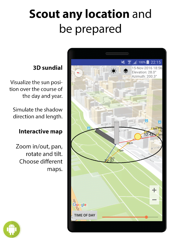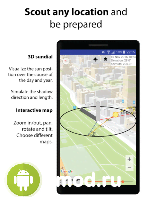 Sun Locator Pro - отличное приложение которое будет полезно не только профессиональным фотографам, но и самым обычным фотолюбителям. Программа позволяет прогнозировать с высокой точностью местоположение Солнца и Луны относительно заданных координат и временного отрезка. Это помогает выставить правильную композицию, расположиться так, избежать контрового света в случаях когда он не нужен и прочее и прочее, что в итоге приведёт к созданию впечатляющего снимка. Ну а наличие карты с 3D объектами (здания и другое, что даёт тень) добавляет ещё больше положительных впечатлений от этого проекта.
