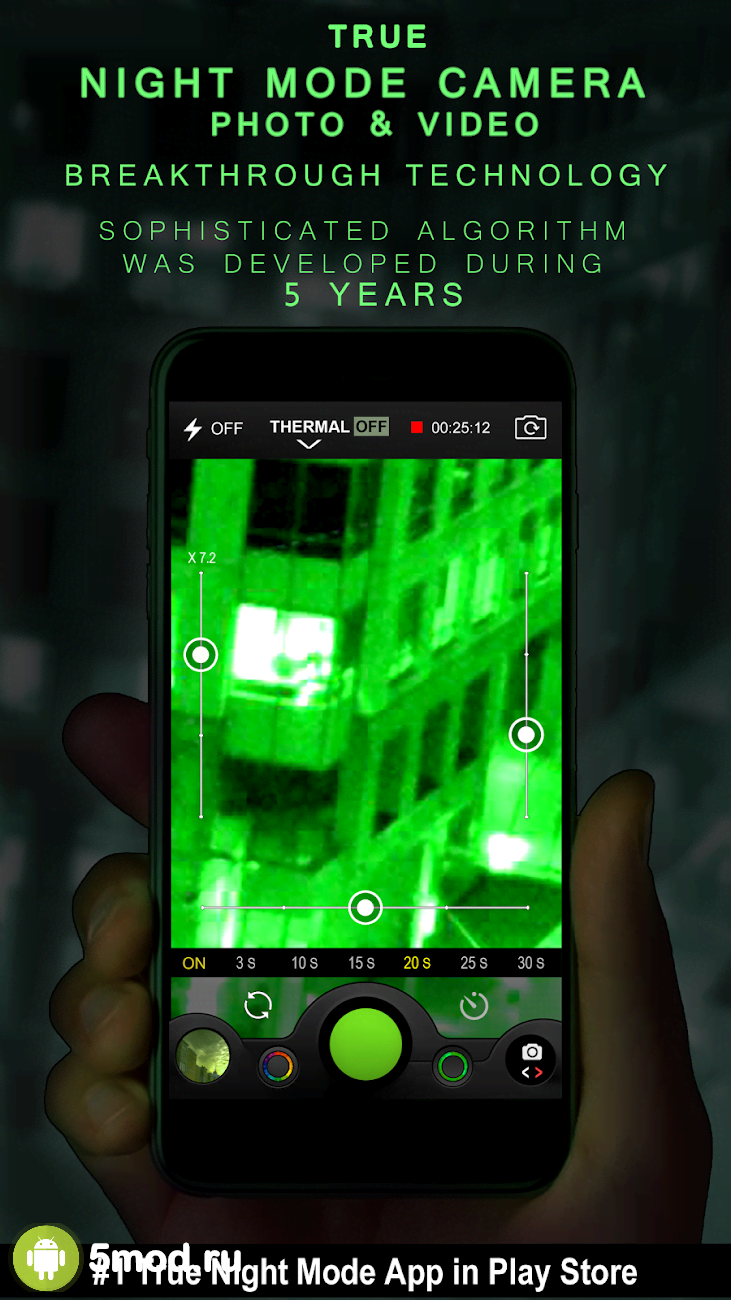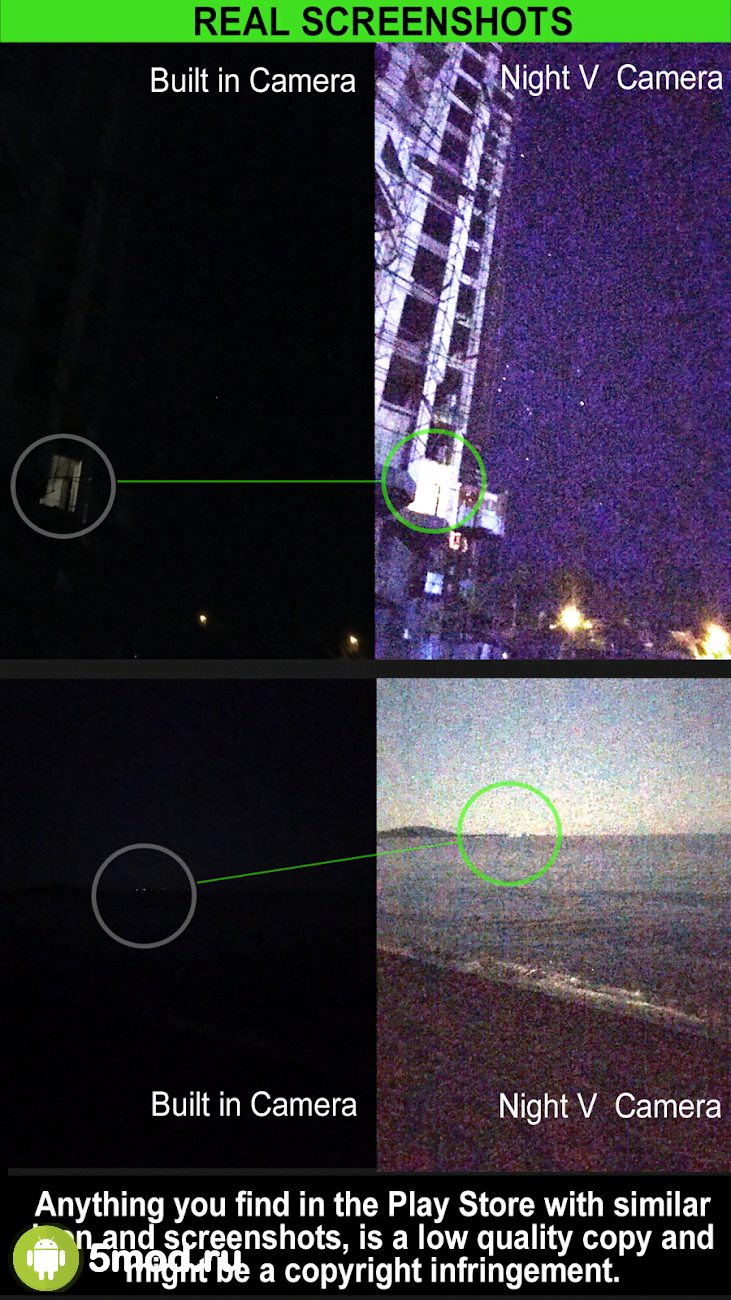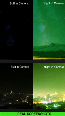 Night Camera (Photo & Video) - полезное в различных ситуациях приложение для создания фотографий. Главной задачей проекта будет работа в условиях крайне скудной освещённости или просто-напросто в ночной темноте. Автоматические настройки и предустановки позволяют вытягивать значения и получать удобоваримые результаты. Конечно же в таком случае речь не идёт о каком-либо качестве. Задранные значения ISO и далеко не профессиональная оптика приводит к большому количеству шума на изображении. Но в некоторых случаях это и не важно. Главное - это демонстрация факта, события и так далее, что важно запечатлеть.