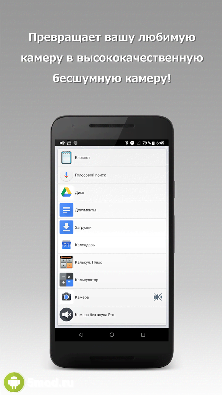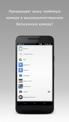 Mute Camera Pro - приложение для настоящих шпионов и просто любителей использовать встроенную камеру мобильного гаджета, как видеозаписывающее устройство. Зачастую при включении этого режима устройство издаёт сигнал оповещающий всех в округе, что кто-то что-то включил. Подобное развитие событий очень нежелательно сразу в ряде ситуаций по само собой разумеющимся причинам. Ну а данная программа позволяет отключать все посторонние системные звуки. Это обеспечит пользователей незаметностью, что поможет получить нужный результат без опасности быть раскрытым.