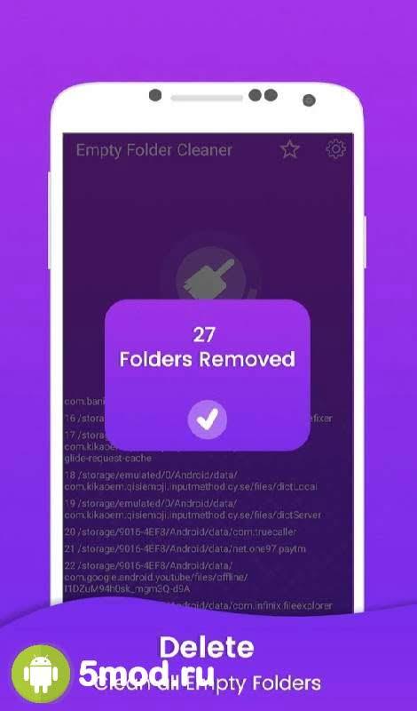Empty Folder Cleaner - Delete Empty Folders - проект направленный на поддержание чистоты и порядка на внутреннем пространстве мобильного гаджета. Пользователи могут самостоятельно убирать пустые, уже не нужные, папки и директории созданные иными программами или же выставить автоматический режим. Различные параметры помогут выстроить выгодную пользователю структуру, чтобы после не задумываться о необходимости поиска и устранения мусорных и лишних файлов. Так же Empty Folder Cleaner работает как с основным гаджетом, так и с SD-картами. Не делая каких-либо для них различий при наведении чистоты.