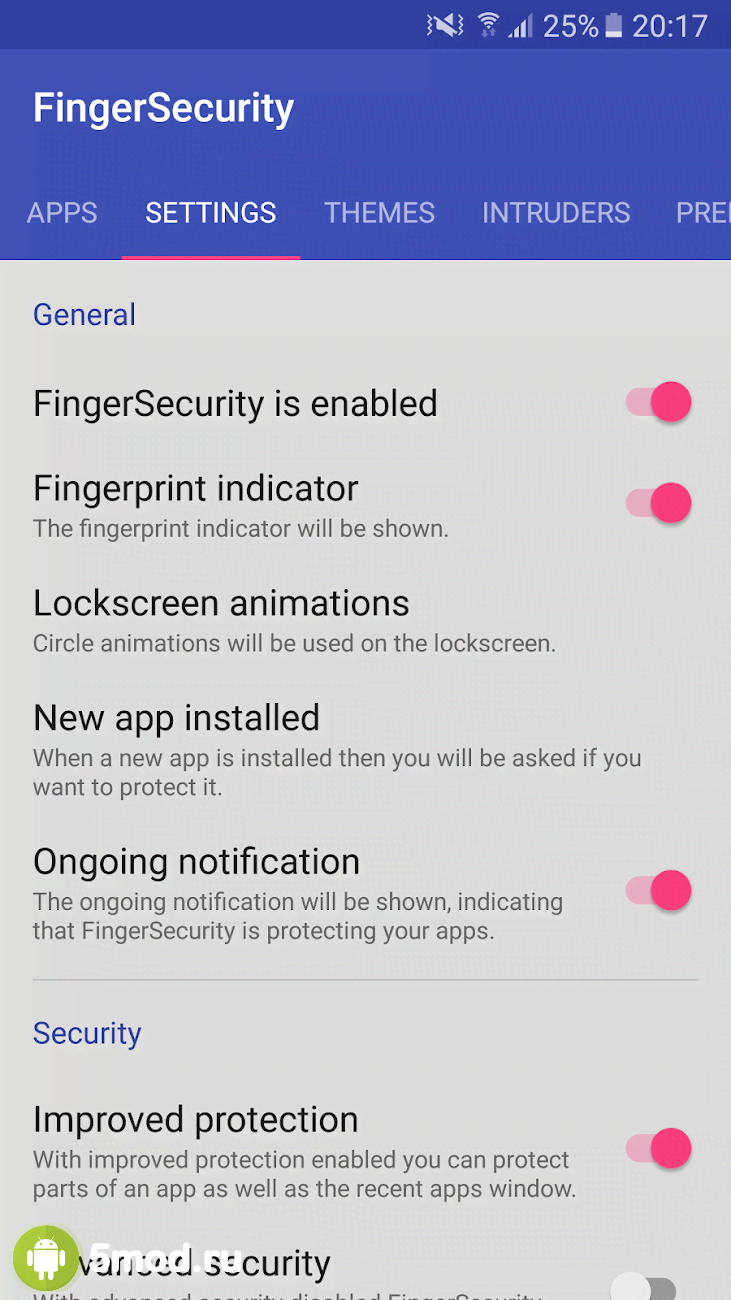 FingerSecurity - полезное приложение тире инструмент для всех пользователей мобильных устройств с наличием сканера отпечатков на нём. Данная программа предлагает существенно повысить безопасность гаджета и конфиденциальной информации, а так же исключить возможности каких-либо несанкционированных действий с прочими приложениями установленными. Достаточно указать какие и в каких условиях не должны запускаться без подтверждения со стороны владельца. Быстрая настройка и ещё более быстрая работа обеспечивает практически нулевые траты по времени при выполнении идентификации.
