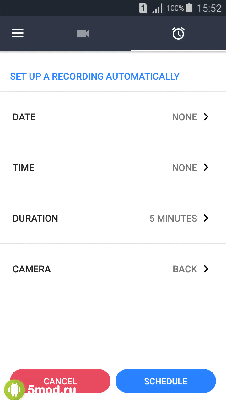 Background Video Recorder - ещё одно зачастую очень нужное приложение для достижения определённых задач. Например имеющиеся функции позволяют отключать звуки затвора включения камеры, а так же заглушает фоновые, что идут при записи видео. Так же имеется пункт работы в незаметном режиме без явных признаков данного процесса на главном экране. Ну а наличие таймера обеспечит серьёзную свободу действий и при этом не вызывая никаких подозрений со стороны посторонних. Подобные качества пригодятся не только "шпионам", но и при многих других случаях и жизненных факторах.
