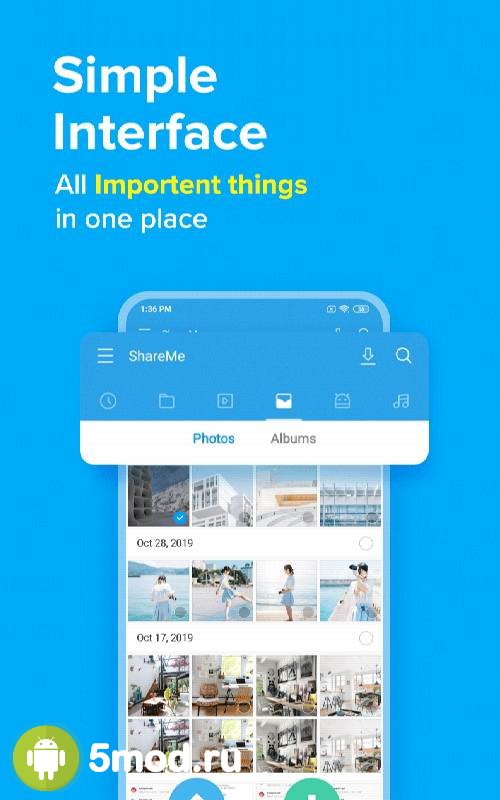 ShareMe: File sharing - приложение, что обеспечивает лёгкое, простое и главное быстрое взаимодействие устройств в плане передачи данных, файлов и всего прочего чем необходимо пользователю поделиться с другими. При этом проект поддерживает любые варианты, форматы и размеры. А так же докачку, автоматическое подключение к более выгодным и экономичным источникам сигнала и так далее. Так что можно не беспокоиться о том, как и что происходит. Результат будет положительным. Эти и многие другие приятные качества, масса дополнительного функционала и лёгкость в управлении и сделали проект настолько востребованным среди аудитории.