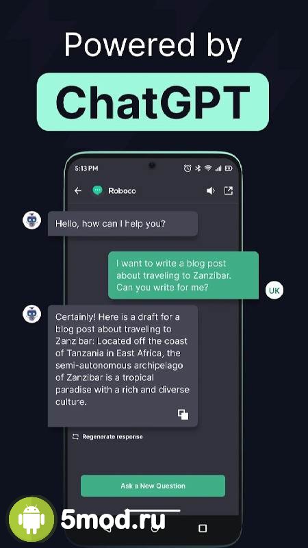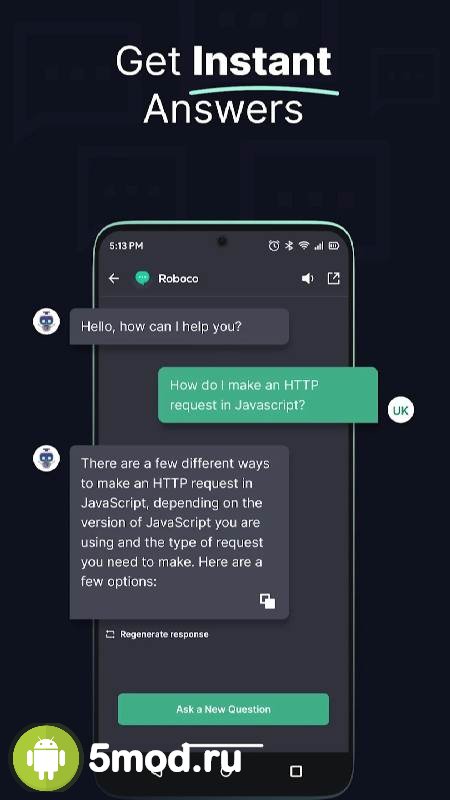 Roboco - AI Chatbot Assistant - ещё отличная возможность для пользователей познакомиться с возможностями искусственного интеллекта для работы, образования и просто общения с получением адекватных и развёрнутых ответов на любые вопросы. При этом ПО работает с последней версией. Что гарантирует максимально качественную деятельность в любых из возможных тем. Традиционно стильный дизайн в духе мессенджеров, удобство ввода, в том числе и с помощью голоса, а так же многое и многое другое и делает представленный проект прекрасной способом получить результат, обновиться и так далее для всех кто заинтересован в подобном.