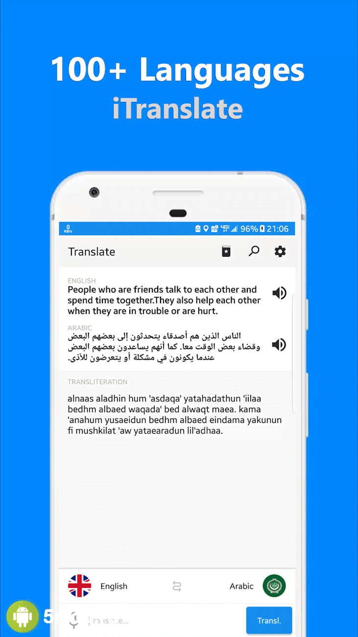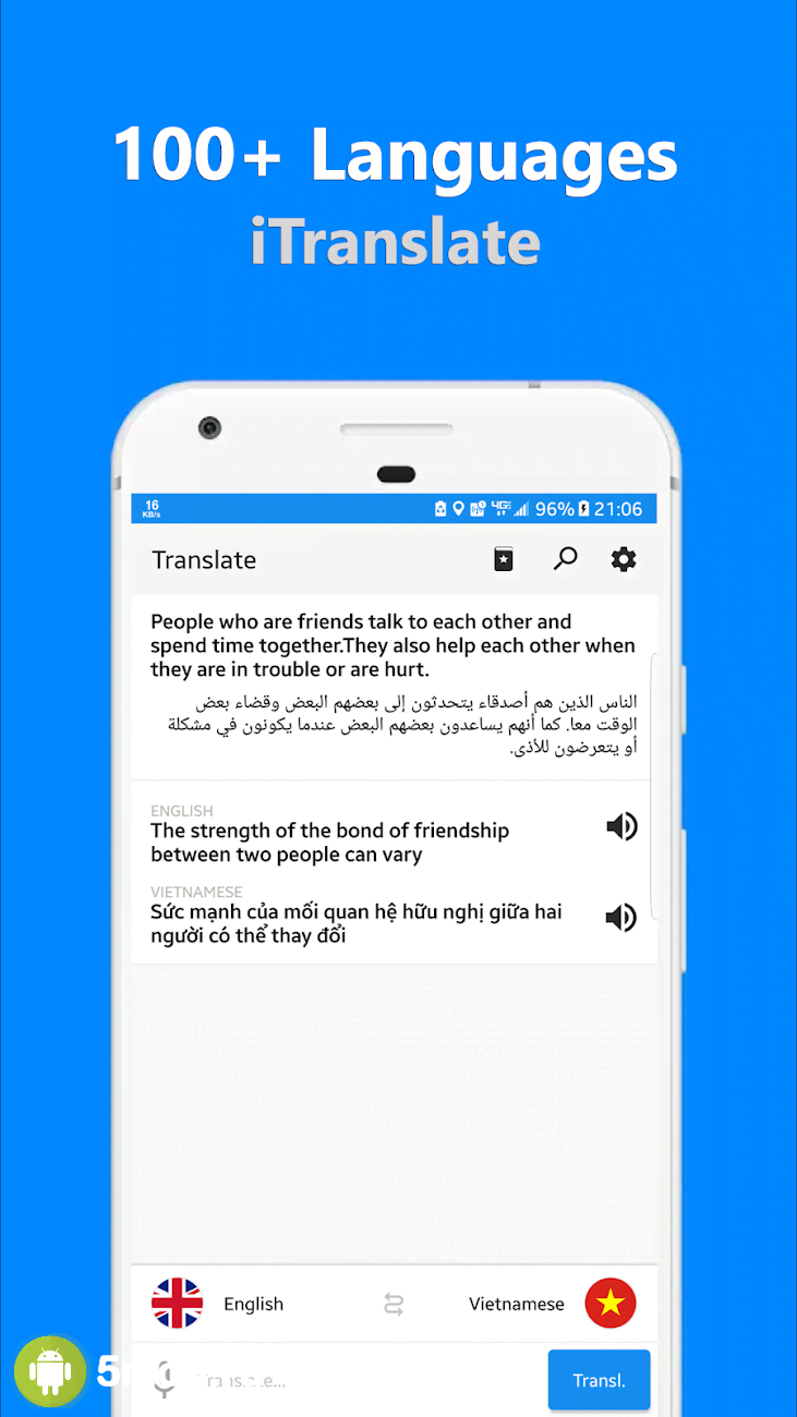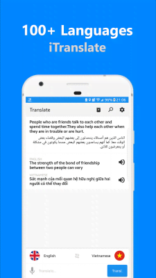 iTranslate Pro - All Language Translator Pro - отличный переводчик, что послужит универсальным решением для самых различных ситуаций. Вместе с ним пользователи получают доступ к более 100 мировым языкам. Что позволит понять собеседника или текст практически в любом уголке нашей планеты. Минималистичный дизайн не отвлекает от основного назначения, внушительный функционал и удобное управление не позволят столкнуться с преградами или потратить слишком много времени на выполнение поставленной задачи. Ну а автономная работа обеспечит всем необходимым пользователей, что предусмотрительно скачают базы данных по выбранным позициям в обширном списке.