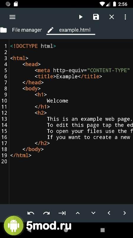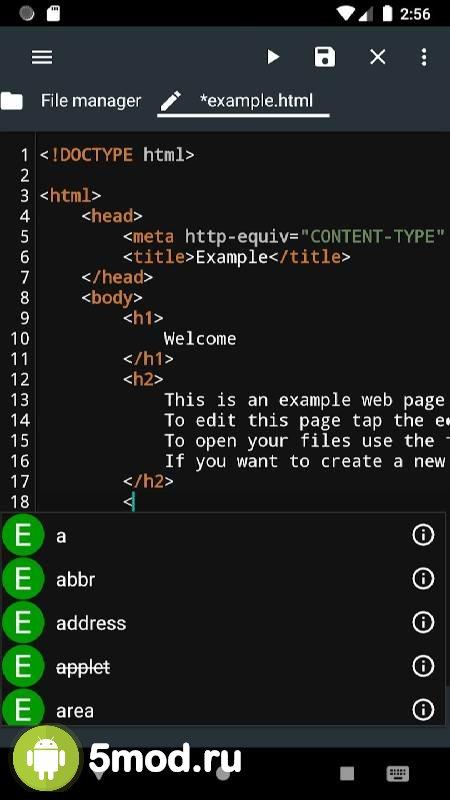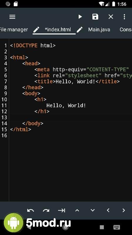 Html Editor - практических свойств редактор предлагающий целый ряд возможностей для ведения полноценной деятельности по написанию кода, проверки и компиляции. Ряд функций гарантирует достаточно комфортную работу даже в условиях качеств мобильного устройства. Автозаполнение, автоматический отступ там где надо, регулярные сохранения, что позволяет не беспокоиться об защищённости, подсветка спорных моментов, быстрая навигация и всё прочее обеспечивает программе заслуженную популярность у пользователей желающих всегда при себе иметь пространство для тестирования и проверки возникших в их голове идей.