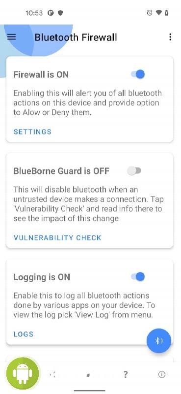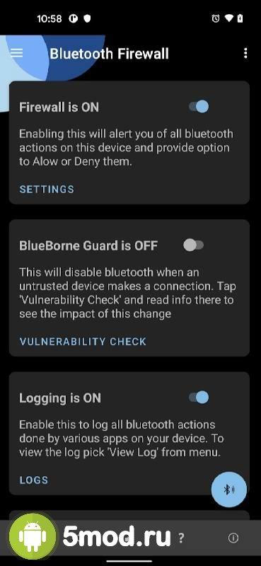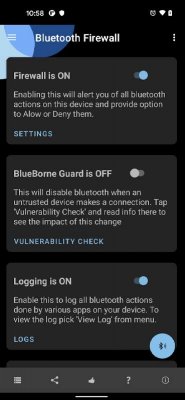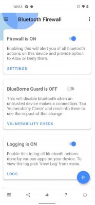 Bluetooth Firewall Trial - приложение-инструмент предлагающее пользователям позаботиться от безопасности своего мобильного устройства в плане Bluetooth-подключения. Проект обеспечивает ряд функций и автоматических операций направленных на поиски всего подозрительного, оповещения и предупреждения о том, что что-то не так происходит в данный момент. Благодаря чему владельцы устройств смогут иметь более полную и детальную картину в реальном времени, своевременно реагировать, видеть происходящие процессы и так далее. Что весьма полезно, да и удобно в современных условиях повседневного риска.
