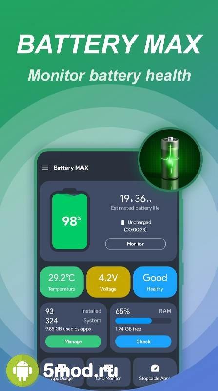 Battery MAX - Smart Charging - универсальный и функциональный проект для пользователей предпочитающих знать максимальное количество фактов и параметров о своём гаджете, постоянно отслеживать его работоспособность, настраивать и регламентировать работу с помощью разных инструментов. Есть и мониторинг батареи, встроенный менеджер приложений, система оповещений о том или ином событии происходящем на смартфоне и многое другое. Что вместе, в купе с симпатичным и наглядным интерфейсом, делают программу очень и очень привлекательным для постоянного применения и использования людьми не желающими что-то упускать из виду.