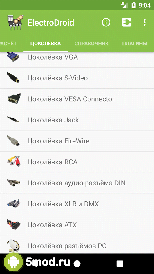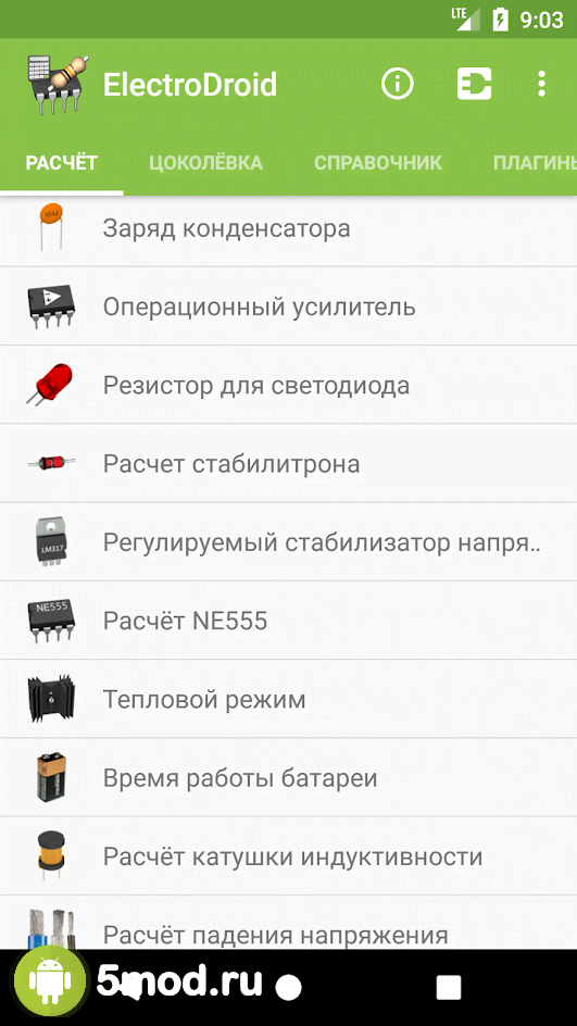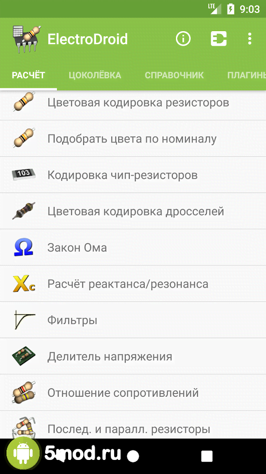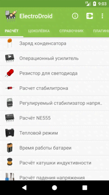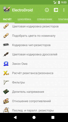 ElectroDroid Pro - очень полезное справочное приложение удачно и продуктивно совмещённое с набором инструментов. Оно предназначено для разработчиков электроники, а так же обычных любителей самого разного уровня знаний и подготовки. И поэтому ничего удивительного в том, что в нём можно будет найти огромное количество нужных и необходимых данных, схем и возможностей. Расчёт реактивного сопротивления, катушки индуктивности, преобразование частоты, цоколёвка (она же распиновка) различных разъёмов и многое другое, что позволит найти правильный ответ практически на любой возникший в процессе работы вопрос.