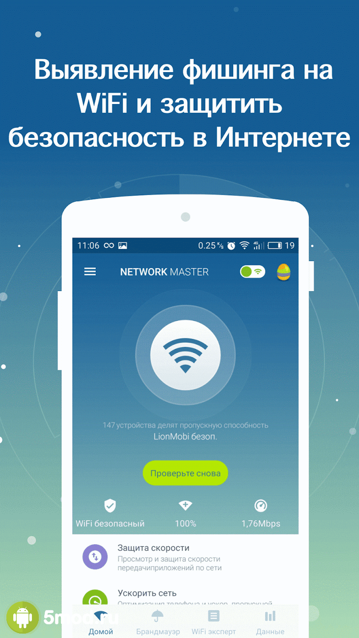 Network Master - Speed Test - крайне полезное и из-за этого популярное приложение для работы с Wi-Fi точками и прочими источниками интернета находящимися под контролем пользователей. И при этом, понятное дело, настройка и все прочие действия происходят с гаджетов, что делает контроль полностью мобильным и оперативным в случае необходимости. Определение параметров, проверка скорости подключения, установка значений, работа с безопасностью и многое другое доступно в понятном и наглядном исполнении. Так же можно детально отслеживать трафик, определять вредоносное и шпионское ПО и так далее, что в итоге обеспечит максимальную продуктивность.