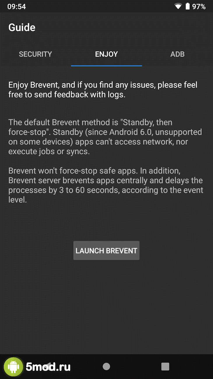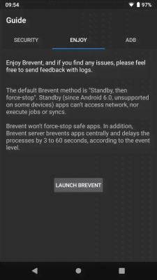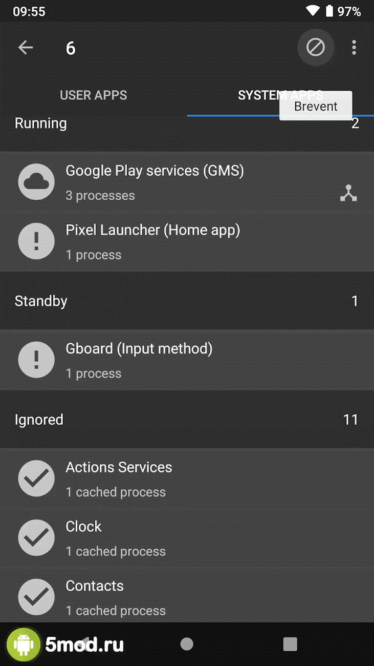 Brevent - полезный инструмент для всех продвинутых пользователей, что волнует самостоятельные и неконтролируемые действия всех приложений, что установлены на гаджете. И что так или иначе постоянно совершают разные действия, что не совсем благоприятно влияют на состояние устройства. С данной же программой любой сможет существенно ограничить свободу подобных приложений или же полностью заблокировать, с возможностью последующего восстановления в правах. При этом есть целый спектр настроек и указаний, что помогают определять границы за которые не будет хода для любой указанной в списке позиций.