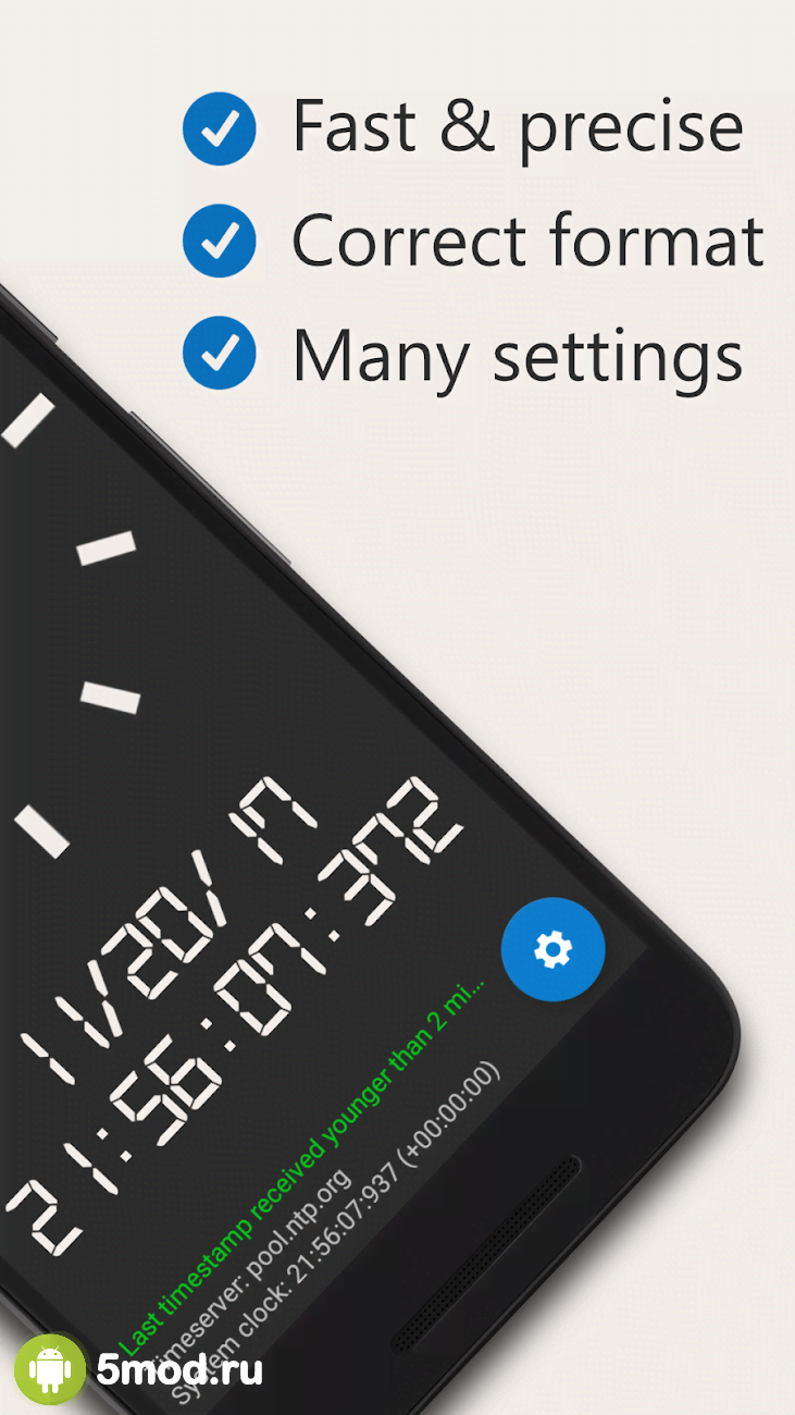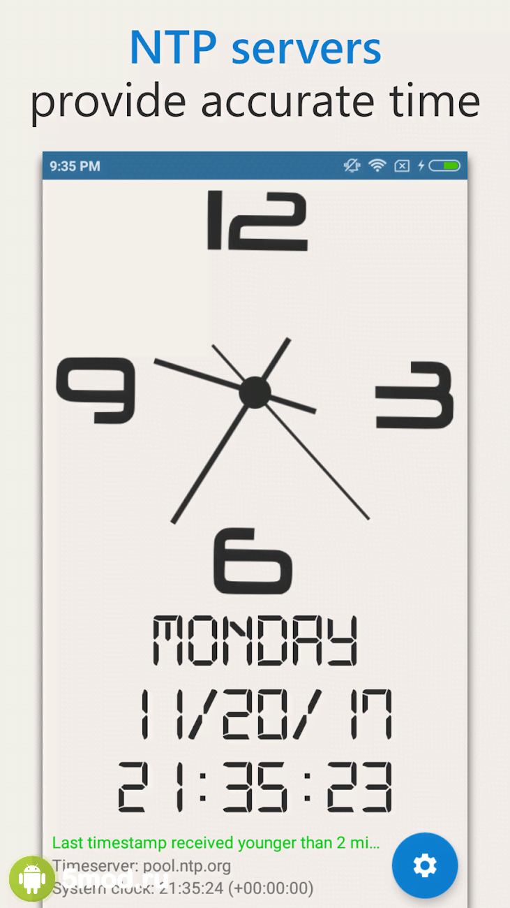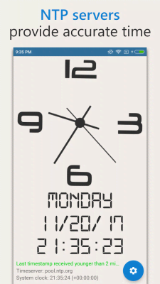 AtomicClock — NTP Time - приложение для самых пунктуальных и желающих действовать согласно действительно точному времени. Проект взаимодействует с NTP-серверами, что в свою очередь имеют дело с атомными часами. Ну а система настроек обеспечивает пользователей выбором и подгонкой программы под свои требования и желания. Несколько циферблатов, видов стрелок, фонов и всего прочего отвечает за визуальное исполнение. Так же есть и виджет способный заменить стандартный вариант, что есть по умолчанию. Это и многое другое гарантированно понравится любому, кому может потребоваться подобный проект.
