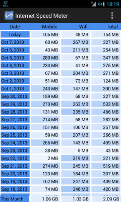 Internet Speed Meter - простое, но очень полезное и нужное приложение для любого пользователя, что хочет докопаться до сути вопроса. Кто и в каком объёме потребляет трафик. И речь идёт о программах, играх, браузерах и всего другого, что так и норовит приложиться к доступу в сеть. Детальное указание позиции и масштаба, интенсивность и пиковые моменты и всё прочее будет распределено по наглядной и точной таблице, что предоставит максимально понятную картину. Ну а статистические данные помогут проследить малейшие изменения в устоявшейся ситуации и сразу же заметить какие-либо аномалии.