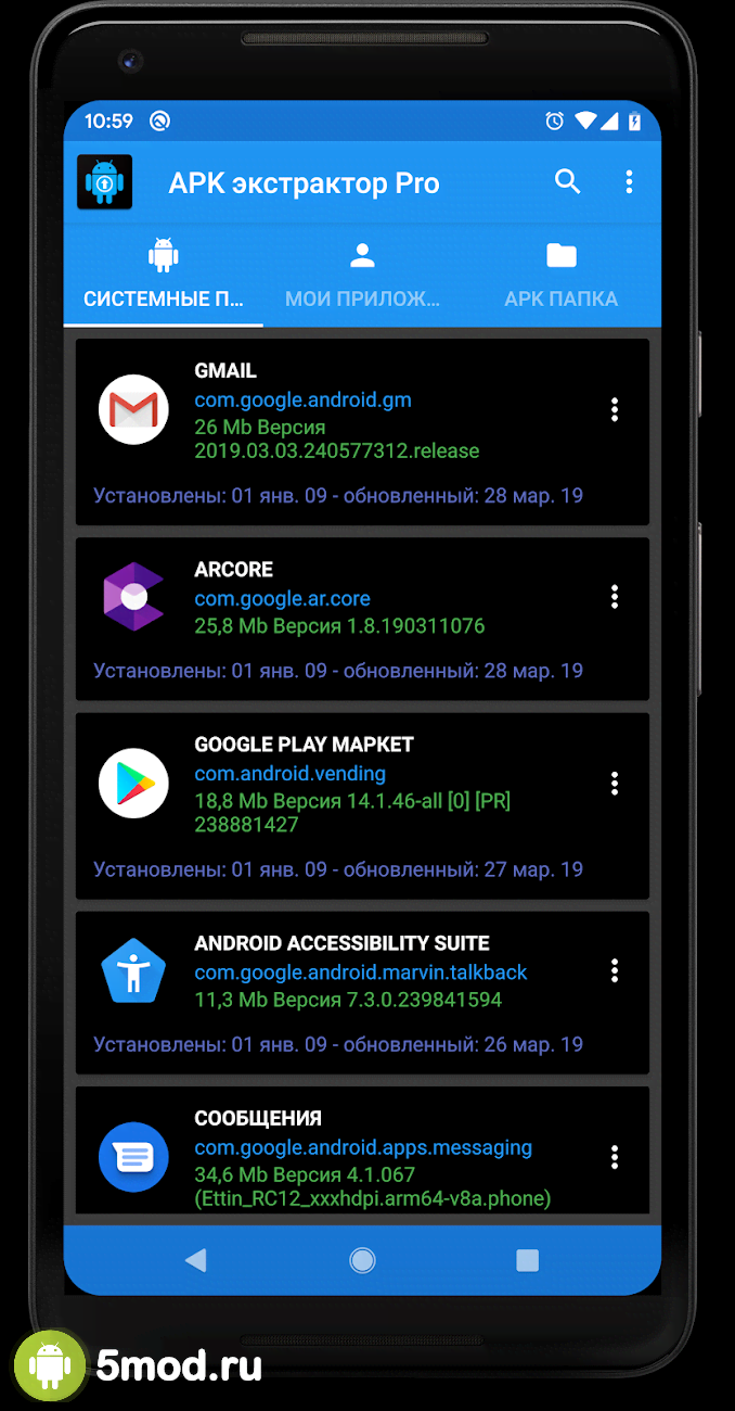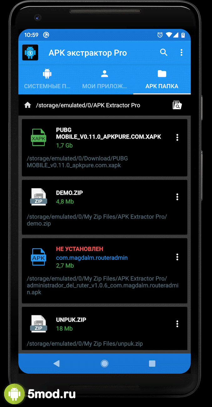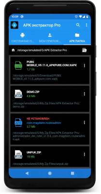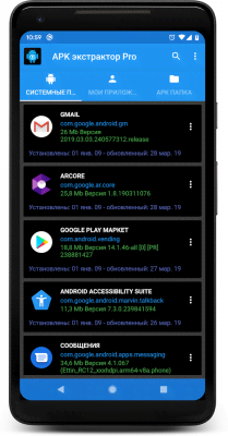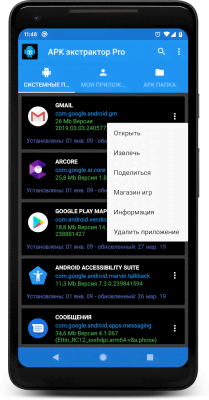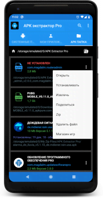 APK EXTRACTOR PRO - простой и удобный в управлении инструмент, что предлагает пользователям возможность оперативного получения apk-файла от установленных на мобильном гаджете программ, игр и так далее. При этом они смогут устанавливать и удалять приложения используя наглядный и минималистичный интерфейс, менять им версии и прочие данные, а так же выполнять многие другие полезные в некоторых ситуациях действия. Можно выбрать и директорию в которую будут сохраняться полученные результаты. Внутреннее пространство или SD-карта - так же не является проблемой.