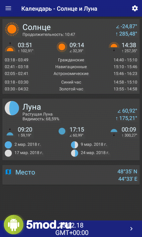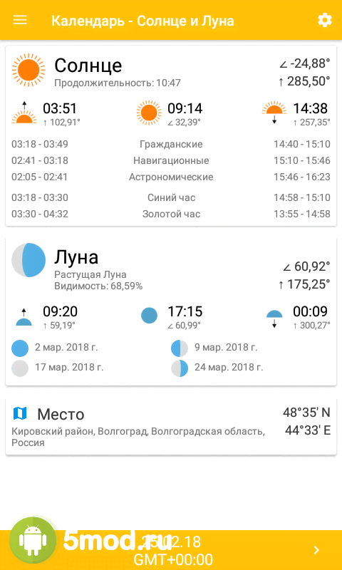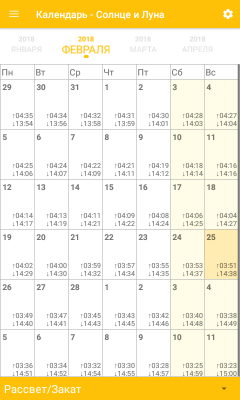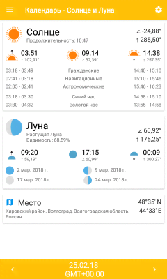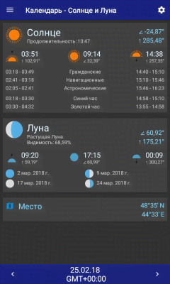 Calendar - Sun & Moon - приложение, что обеспечит пользователей всеми необходимыми данными о времени восхода и заката Солнца, появления Луны, её фазы, местоположения и всего прочего. Исходя из того факта, что человек может находиться в любой точке мира. Программа проанализирует указанную точку и выведет скорректированные, но точные данные. Так же можно получить информацию о семерках и прочих промежутках времени, что предшествуют или сопровождают определённые моменты. Программа может стать отличным помощником для самого разных категорий пользователей, в их профессиональной деятельности или хобби.