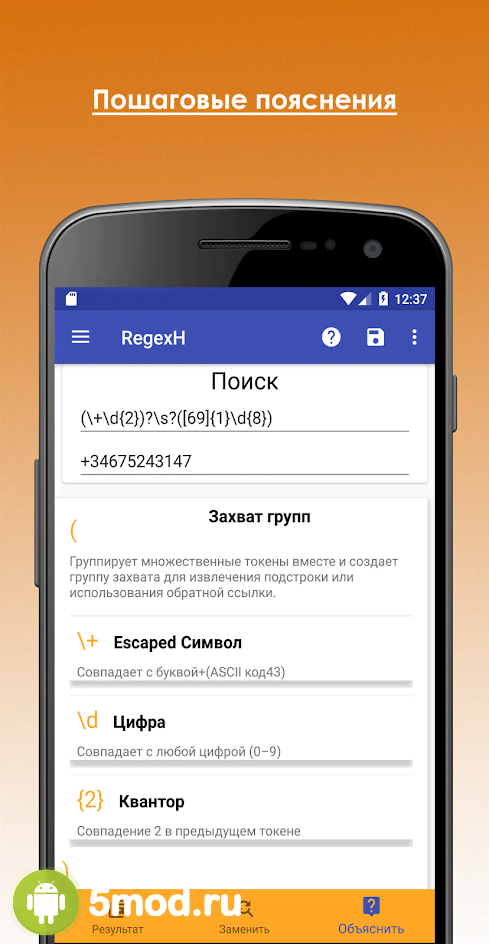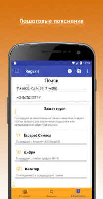 RegexH - очень и очень нужное и даже ценное приложение для изучения (а так же самостоятельного добавления собственных значений) регулярных выражений из разных уровней, различных символов и так далее. Особенность проекта в том, что каждый символ расшифровывается и указывается для него назначение, что делает программу аналогом словаря-переводчика для иностранных языков. Так же можно узнавать значения выражений, делать замены, видеть группы, генерировать новые и сохранять те, что регулярно используются самими пользователями. Ну а приятный дизайн и управление поможет правильно и без лишних проблем находить то, что требуется.