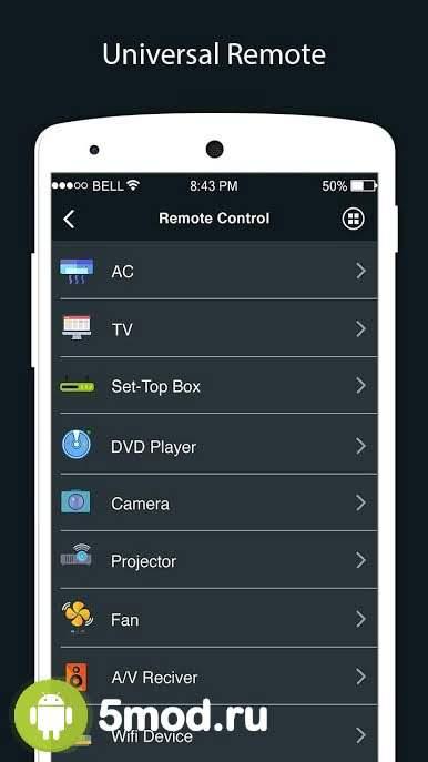AC Remote Control - Universal Remote Control - приложение с помощью которого пользователи смогут с лёгкостью превратить мобильный гаджет в пульт дистанционного управления. При этом впечатлит универсальность данного проекта. Можно в несколько нажатий переключаться между разными настройками и предназначениями. Телевизор, кондиционер, камеры безопасности, установка температуры в котле и многое, многое другое в списке возможностей для деятельности. Так же можно использовать экран устройства как дополнительный источник информации, что в реальном времени поставляют те или иные устройства.
