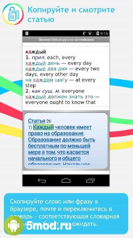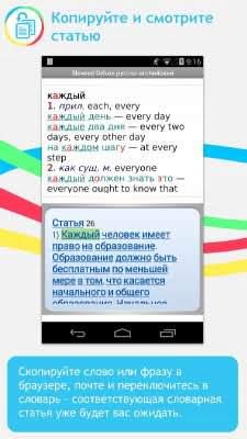 Slovoed Dictionaries - справочное приложение, что обеспечивает пользователям доступ к более чем 260 словарям для 35 языков, а так же прочим материалам предоставляющим нахождение ответов на какие-либо вопросы со стороны человека. И главное здесь работает общий поиск. Что существенно ускоряет получение желаемого результата. При этом есть и интересные особенности данного процесса. Можно не полностью знать грамматику того или иного слова. Даже частичное написание интересующего выражения гарантирует список возможных совпадений с тем, о чём шла речь в строке запроса. Это и многое другое понравится всем кто хочет заполучить универсальный и очень впечатляющий своими качествами источник информации.