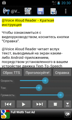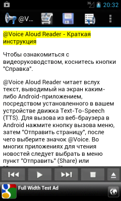 @Voice Aloud Reader - полезное приложение для тех у кого нет возможности по тем или иным причинам читать с экрана мобильного устройства. Программа читает текст вслух в весьма удобоваримом ключе и качестве. Проект так же автоматически определяет язык оригинала, что позволяет воспроизводить самые сложные текстовые исходники. Высокая всеядность позволяет "читать" письма, учебники, новостные ресурсы (и весь прочий интернет), электронные книги, документы и многое другое. Для некоторых людей - это крайне удобно и зачастую необходимо.