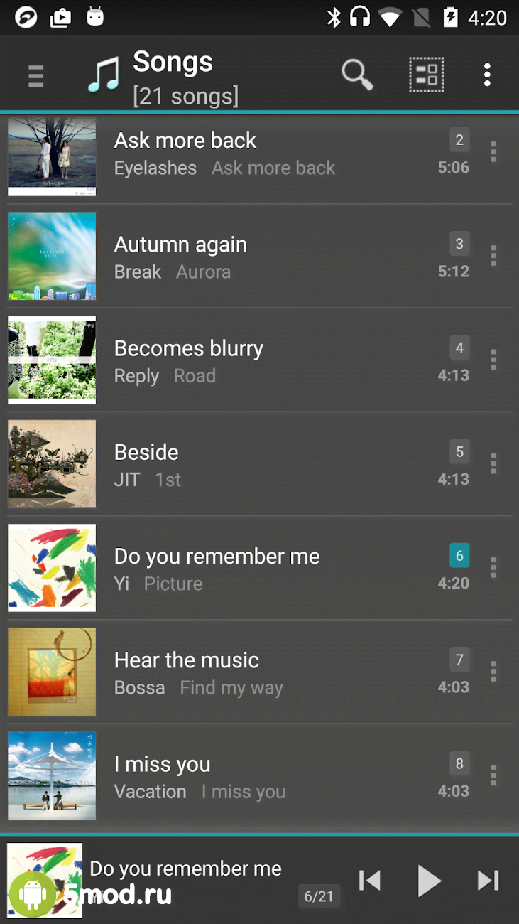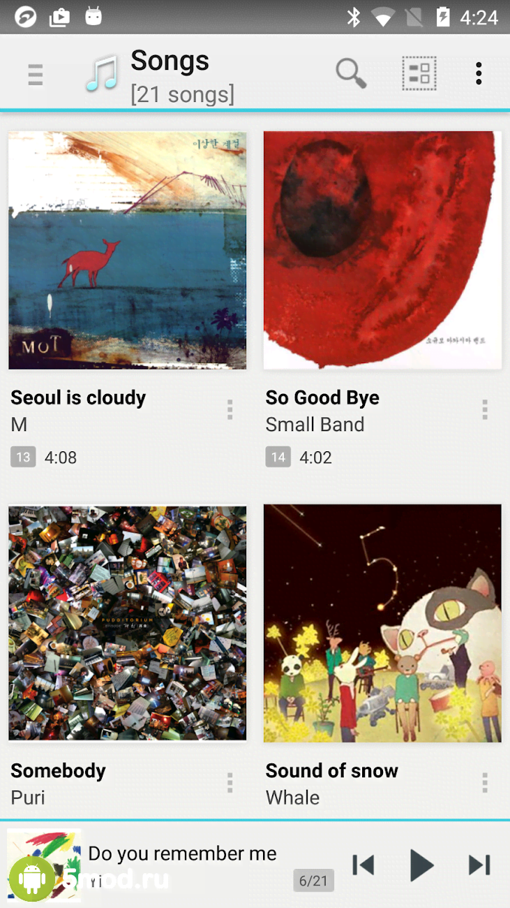 Интерфейс удобный, цвета не слишком яркие и не бросаются в глаза, а элементы управления расположились в удобных местах. В верхней части экрана стартовой страницы вы найдете поисковую строку, не только по композициям, но и исполнителям, альбомам и жанрам музыки. После первого запуска, плеер просканирует память устройства и добавит все композиции. Можно просмотреть все найденные альбомы (имеется обложка), исполнителей и количество треков внутри каждого из них.