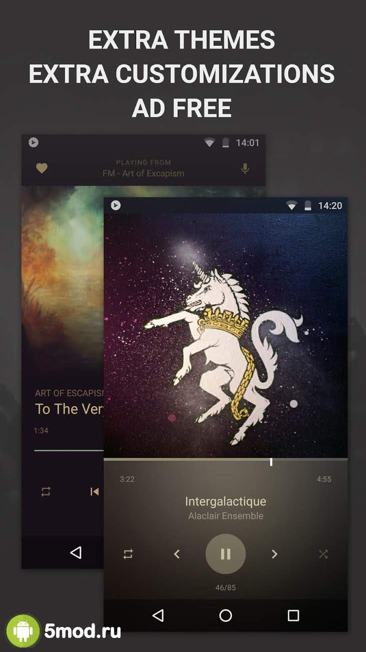 BlackPlayer EX Music Player - красивый, стильный и функциональный аудиопреер, что порадует сразу несколько категорий пользователей. Тут с самого начала и впечатляющее визуальное исполнение и возможность самостоятельно настроить самые мельчайшие детали и элементы под свои требования и желания. А так же внушительный список настроек, что помогут подогнать звучание под свой уровень и создать все необходимые плейлисты, подборки, коллекции и категории для прослушивания музыки в самых любых ситуациях. Но и кроме этого меломан найдёт тут много полезного и актуального для современных проектов.