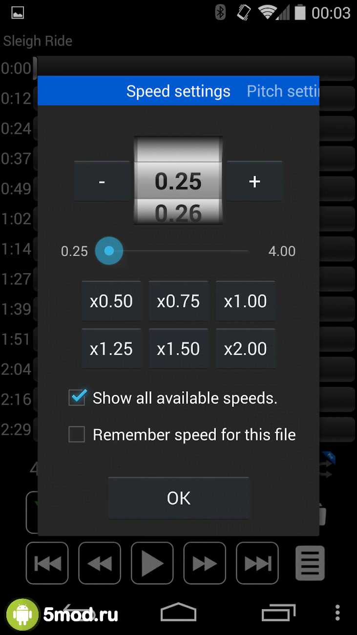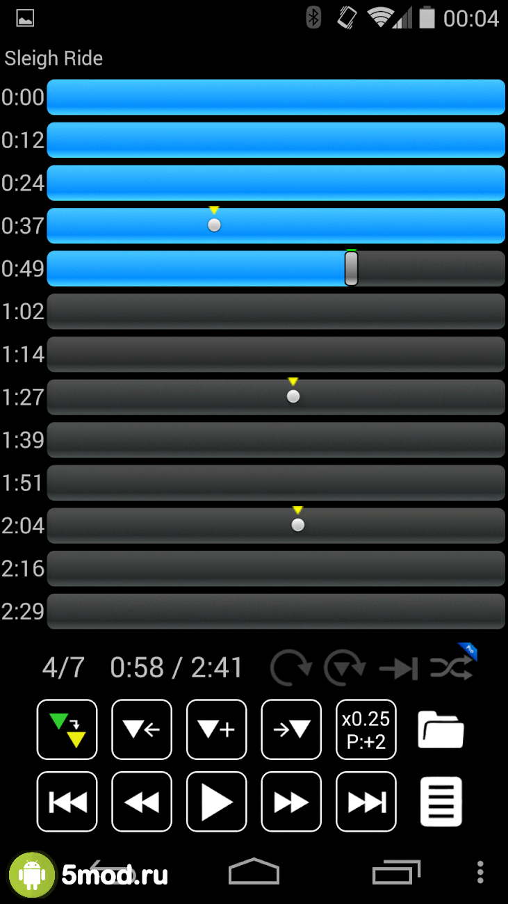 Audipo:Audio Speed Changer - музыкальный плеер обладающий весьма редким и даже оригинальным функционалом. Он может менять скорость звучащей музыки, а так же, конечно же, всех других аудио файлов. Это очень полезно для целого спектра задач. Можно более удобно изучать уроки, особенно по иностранным языкам, прослушивать записанное интервью, лекции и так далее, что только может потребовать более спокойного и удобоваримого течения записи. Удобное управление прямо во время проигрывания, возможность ставить точки-закладки для определённых моментов и многое другое порадует пользователей.