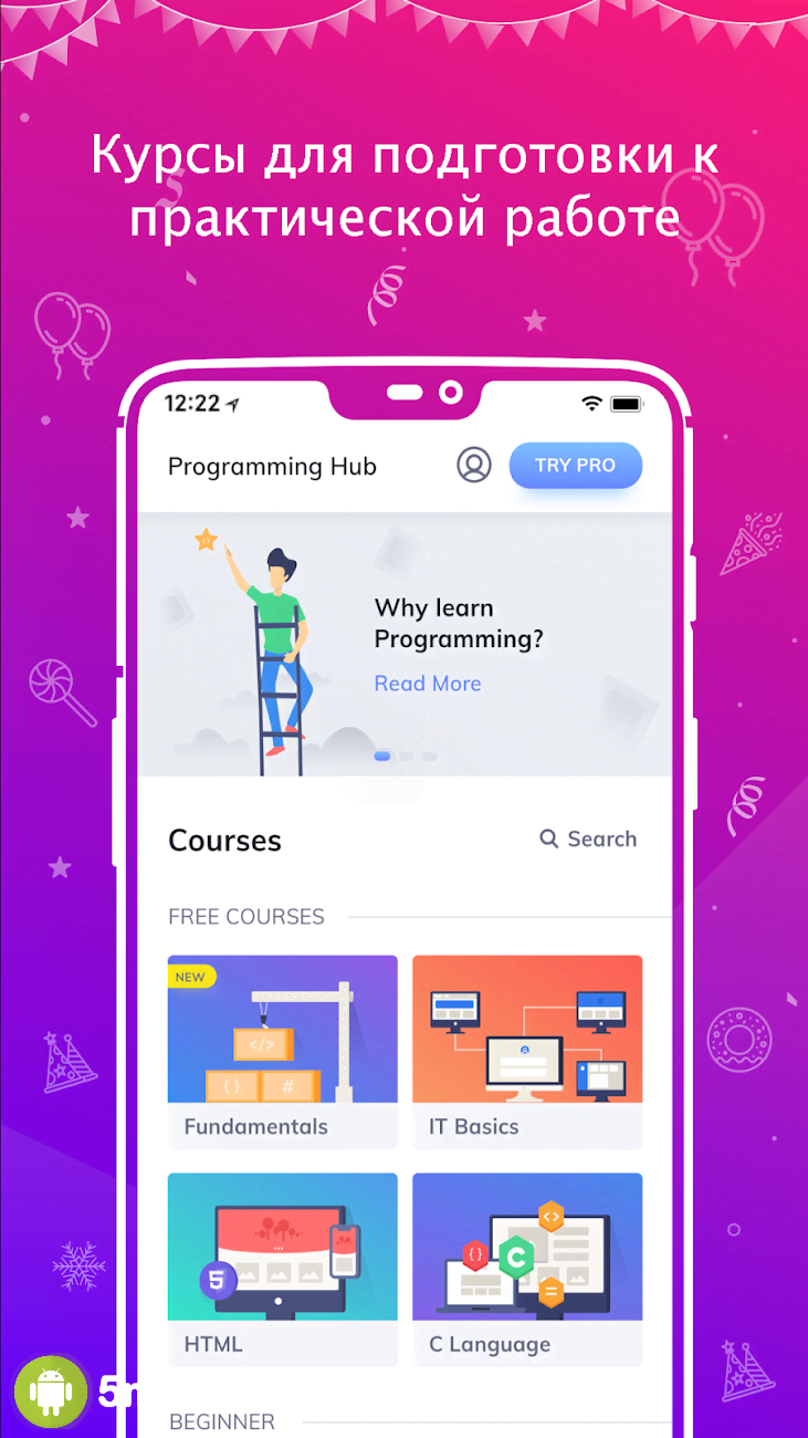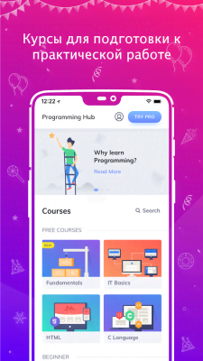 Programming Hub: Learn to code - классное образовательное приложение, что порадует всех желающих научиться программировать. Но сначала им предложат для этого изучить различные языки. HTML, jаvascript, C ++, Swift, Python, Java и другие. И всё это в стильной и качественной визуальной составляющей. У новичков не возникнет ощущения мрачности и безысходности. Хотя это нормально учитывая чем они собираются набивать свои мозги. Но выбор сделан и впереди их ждёт множество курсов предлагающий шаг за шагом постигать азы, а потом и тонкости ремесла. Ну а после можно и попробовать свои силы.