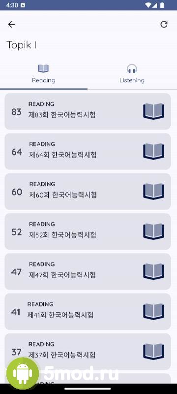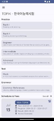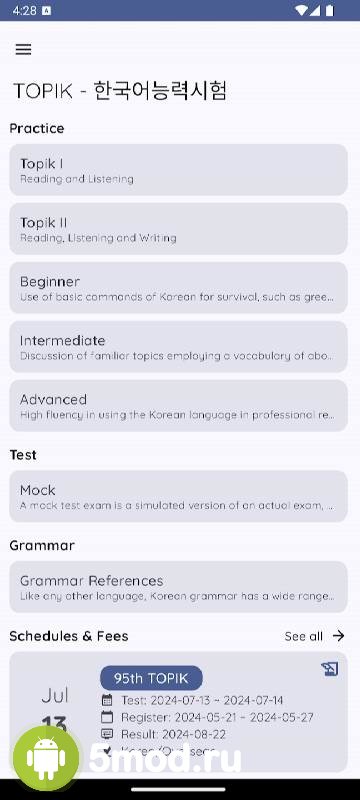 TOPIK - 한국어능력시험 - образовательное приложение призванное помочь пользователям с изучением корейского языка. Проект разделён на три основные части. Каждая из которых имеет ещё несколько подразделов. Что обеспечивают спокойное и гармоничное постижение новой информации, наработку практики, а так же постепенного перехода от простого к сложному. Понравится и разнообразие тестов, что позволяет постоянно пробовать свои силы, выявлять пробелы в знаниях, параллельно узнавать массу нового и так далее. Ну, а регулярные обновления следят за тем, чтобы ПО было актуально и оптимально под современные языковые особенности.