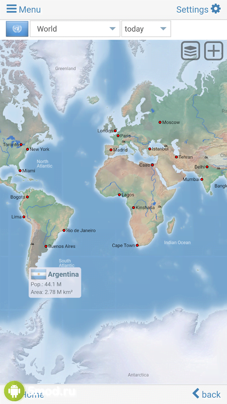 World atlas & world map MxGeo Pro - отличный проект, что станет не только замечательным и ценным помощником в образовательном процессе, но и источником различных данных для любопытных людей. Он представляет собой мировой атлас с политическими, экономическими, разными историческими границами той или иной страны, рельефом местности, расположением областей, провинций и прочих субъектов, столиц, крупных городов и так далее. И всё это с удобным управлением и регулярно обновляемой информацией по всем позициям. Приложение просто идеально для всех кто заинтересован в получении подобных данных.