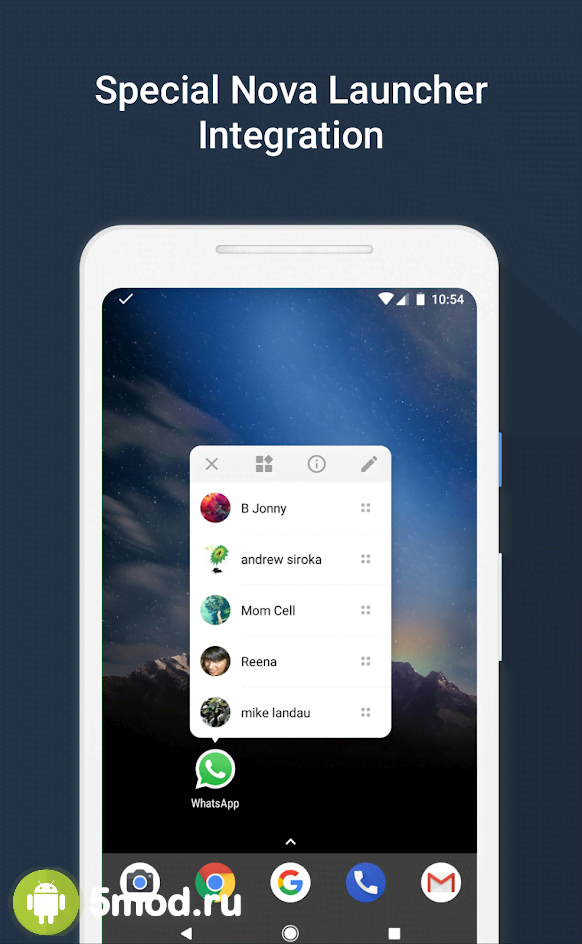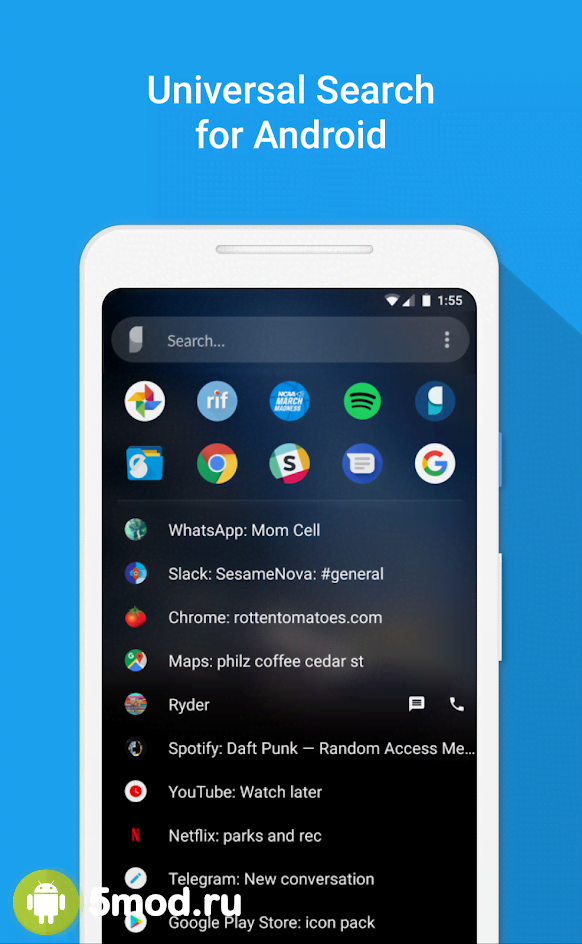 Sesame - Universal Search and Shortcuts - приложение предназначенное для персонализации рабочего пространства экрана мобильного устройства и представляет собой не совсем обычную строку поиска на замену стандартной. Отличительной чертой проекта является то, что он визуально меняется в зависимости от выбора пользователями своего лаунчера и прочих настроек. Лучше всего Sesame раскрывает свои возможности при взаимодействии с Nova Launcher, но поддерживает так же и прочие оболочки. Вместе с ним идёт набор интересных иконок, а так же другие приятные качества.