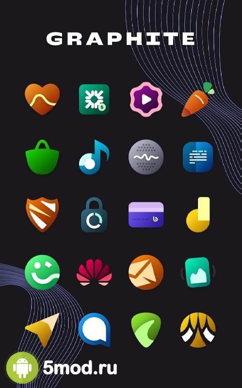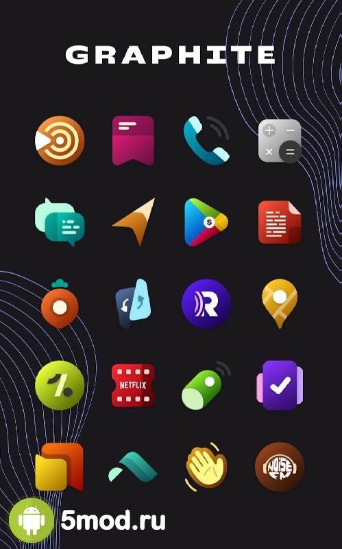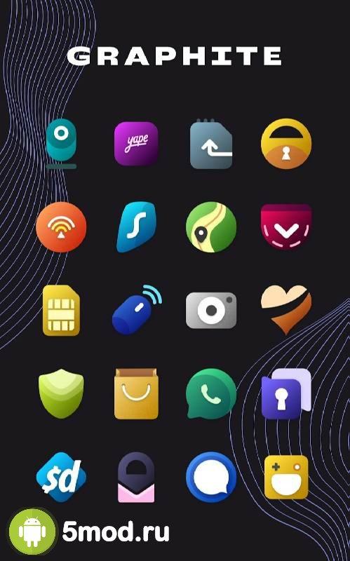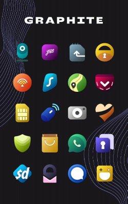 Graphite Icon Pack - ещё одна прекрасная причина пользователям задуматься об обновлении рабочего стола мобильного устройства за счёт смены внешнего вида иконок на нём. В этом случае они получают чёткие линии, отсутствие фона, яркие цвета, насыщенную палитру, а так же большое количество значков. Которые будут регулярно пополняться новыми работами. Есть и механизм запроса новых элементов, предварительный просмотр, обои в комплекте, что удачно подобраны по дизайну, а так же простая установка. Благодаря чему взаимодействие с этим приложение будет только приятным и беспроблемным для людей решивших всё же на изменения.