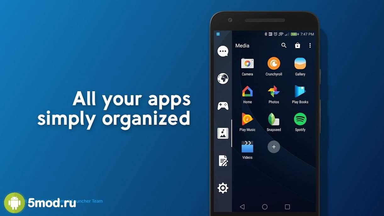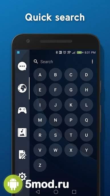 Smart Drawer - Apps Organizer - приятное в применение приложение, что будет важно всем кто хочет существенно расширить полезное пространство рабочего стола мобильного устройства. Проект предлагает скрыть под одной иконкой запуск дополнительного окна с одной из сторон экрана. Там следует расположить полезные программы, подборки игр и так далее по вкусу и требованиям владельца гаджета. Так же можно выстроить систему управления жестами, добавить ПИН-код, автоматизировать различные функции и многое, многое другое. Проект станет отличным способом решения проблемы с местом.
