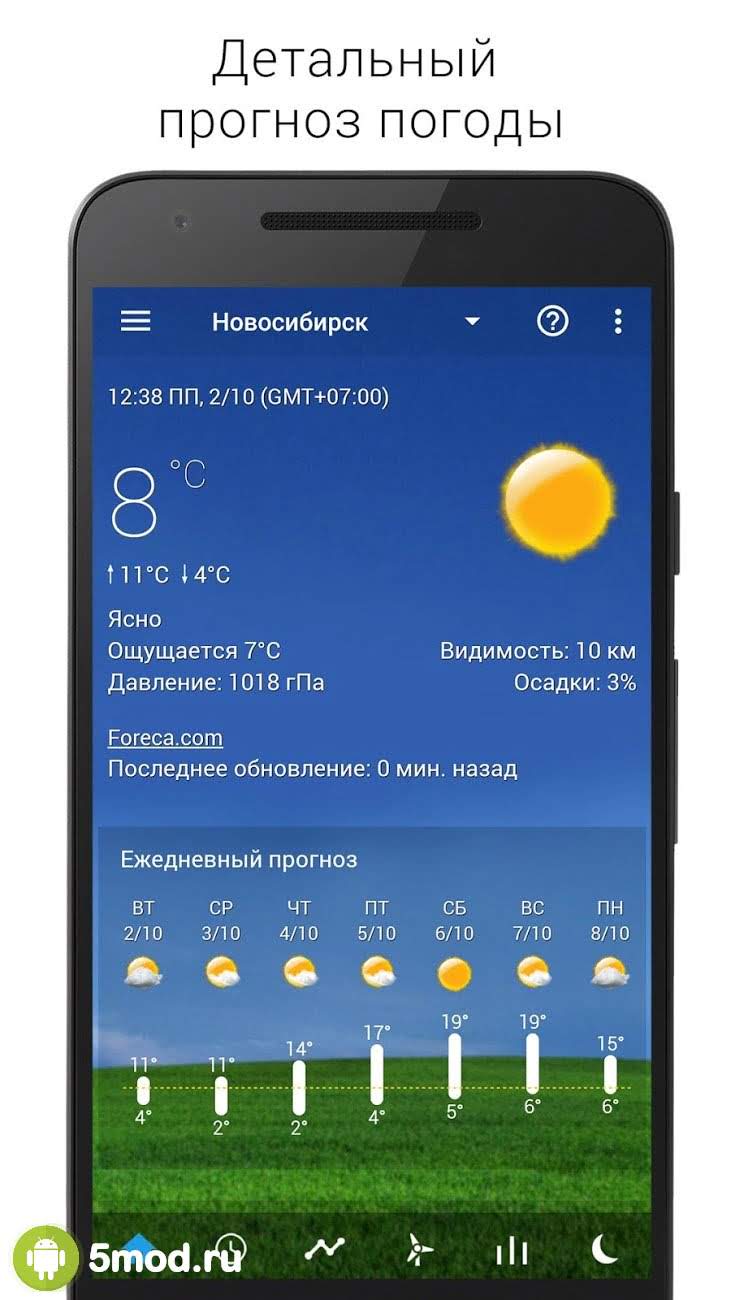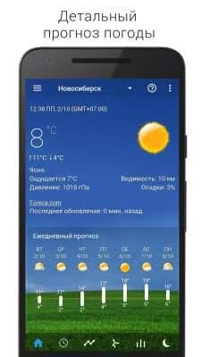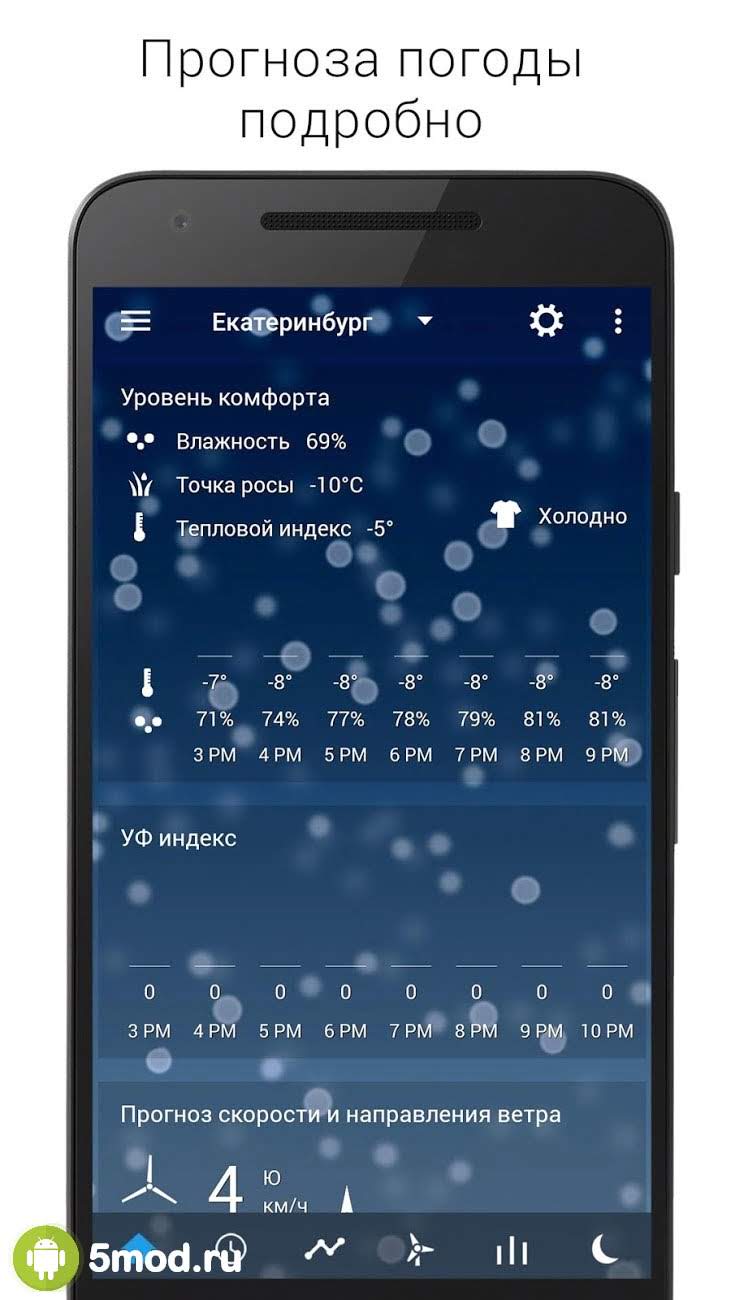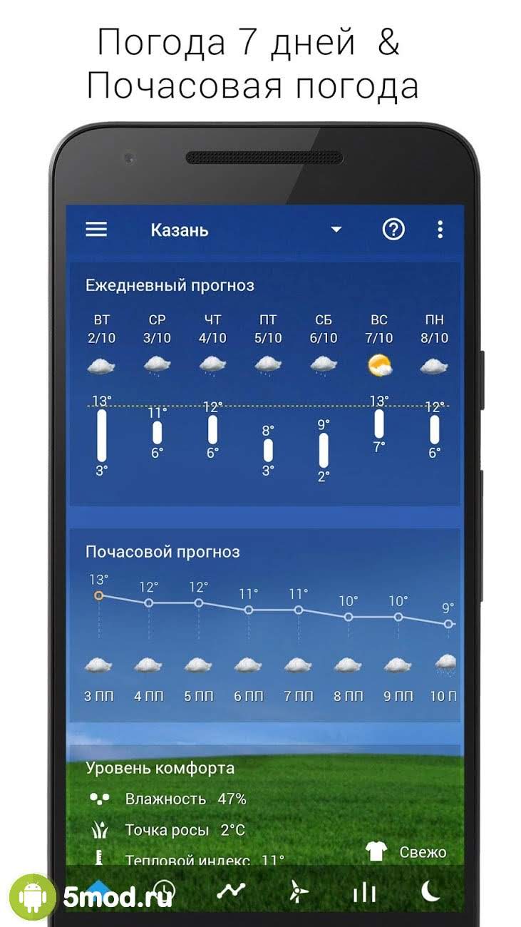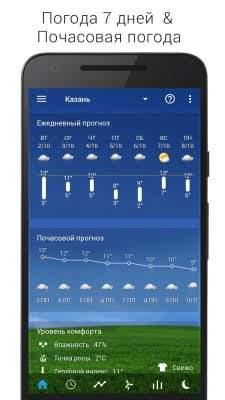 Sense V2 Flip Clock & Weather - одно из самых известных и популярных погодных приложений, что удачно совмещает в себе сразу несколько функций. Проект в стандартных настройках представляет собой крупный виджет часов срощенный с минималистичным прогнозом. Ну а перейдя на основную страницу программы можно найти огромный поток информации, что обеспечивает любопытных пользователей самыми детальными данными. Они помогут не только одеваться по погоде, но и понимать, какие капризы природы их ждут в ближайшие недели. Красивая графика, стильный дизайн и прочие приятные особенности делают программу так же одной из самых качественных в визуальном плане.