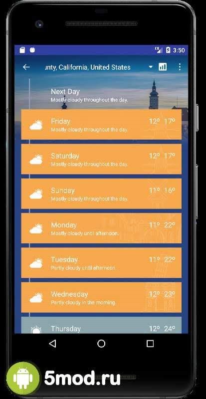 Weather Forecast Pro: Timeline, Radar, MoonView - погодное приложение, что понравится фанатам категории за счёт своих визуальных качеств и спектра практического применения. Различные автоматические процессы обеспечивают практически полное отсутствие действий пользователей для переключений, настройки и прочего, что требуют другие представители жанра. Достаточно определить те границы, что интересуют человека, чтобы после получать исчерпывающую информацию и не продираться через массу ненужных функций. А вариативная система виджетов так же оставляет только самые приятные впечатления от работы с ними.