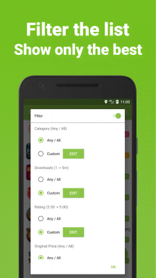 App Hoarder - полезное приложение для пользователей мобильных устройств, что стремятся заполнить свой гаджет самыми разными программами, нужными или абсолютно бесполезными. Зачастую у них есть ценник, что останавливает покупателя по тем или иным причинам. Данный же проект в автоматическом режиме отслеживать акции, кратковременные скидки и всё прочее, что регулярно и иногда совершенно незаметно происходит. Таким образом человек сможет быть всегда в курсе последних важных для них событий на полках магазинов. Удобное управление, наглядный дизайн и разные настройки помогут наладить идеальный процесс.