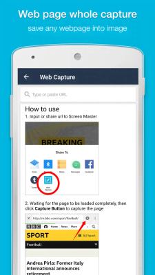 Screen Master: Screenshot & Longshot, Photo Markup - отличное приложение для всех кому необходима более продуктивная функция создания скриншота чем стандартный вариант имеющийся на каждом мобильном устройстве. Эта программа предоставляет очень удобную форму работы. Она не только может быть полностью запущена, как полноценный процесс, но и быть интегрирована в интернет-браузер для создания изображения только открытой страницы. Так же она помогает "сшивать" сразу несколько. Ну а система настроек порадует всех кто обожает подгонять все процессы под свои желания и требования.